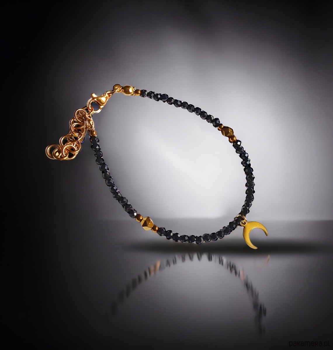 użyte kamienie: czarny turmalin - najsilniejszy kamień ochronny (fasetowane kuleczki 3mm) oraz złoty hematyt 2 i 4mm (przekładki)