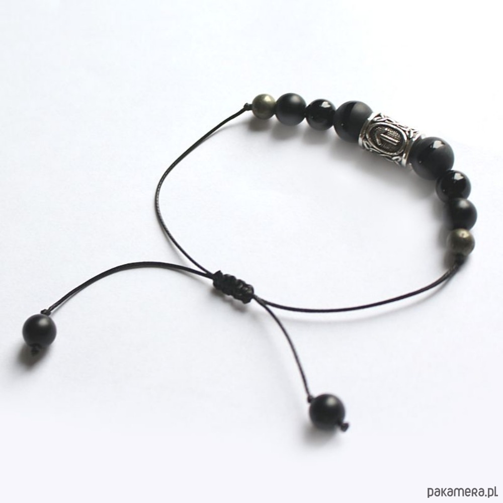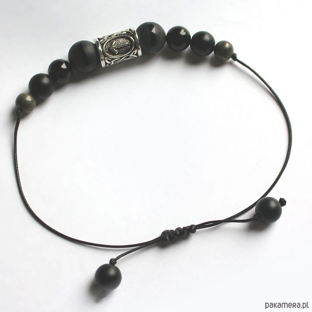 Energetyczna ochronna bransoletka wykonana techniką shamballa z runą Tiwaz, matowym onyksem, pirytem i czarnym turmalinem, wspierająca męskość, przedsiębiorczość, zaradność.