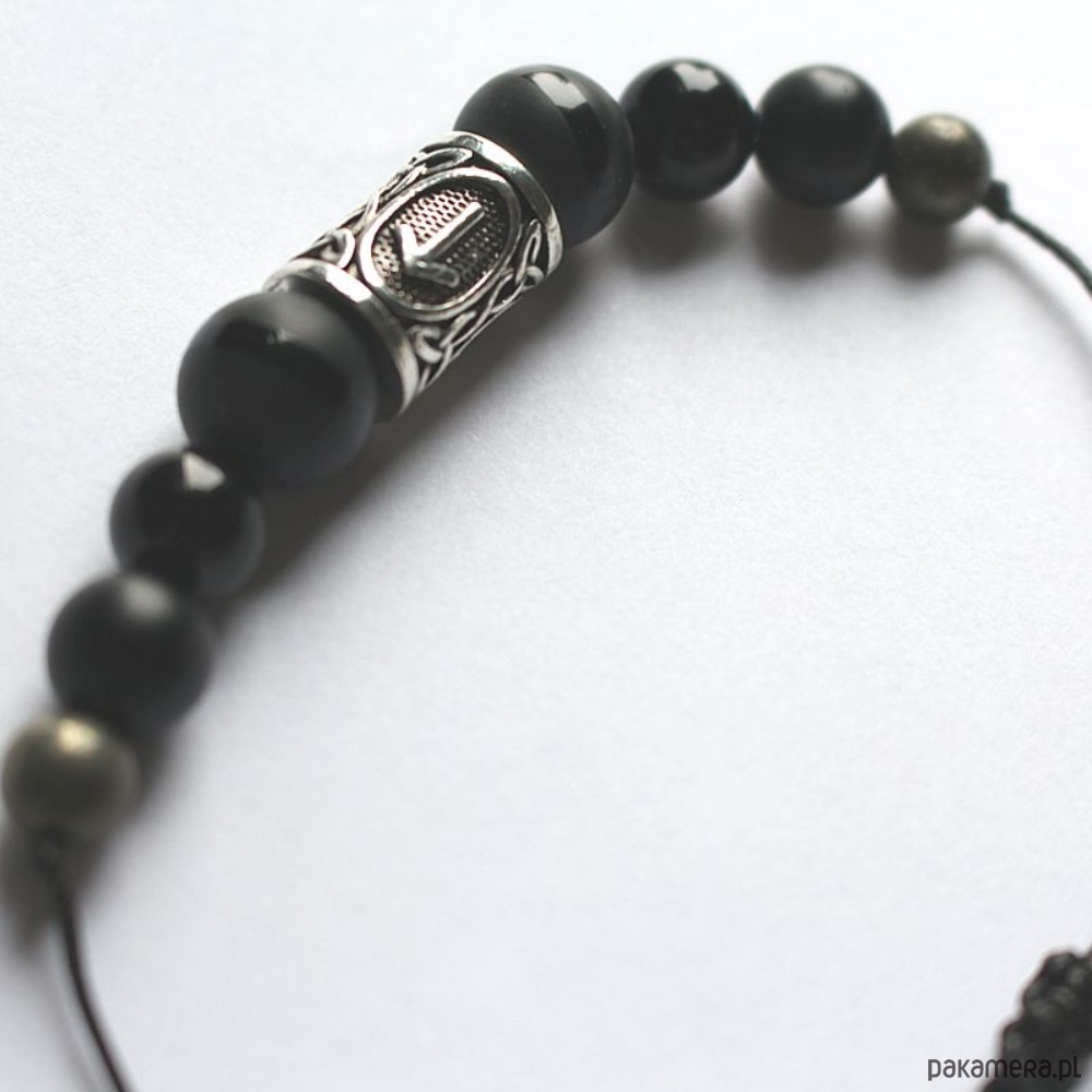 Energetyczna ochronna bransoletka wykonana techniką shamballa z runą Tiwaz, matowym onyksem, pirytem i czarnym turmalinem, wspierająca męskość, przedsiębiorczość, zaradność.