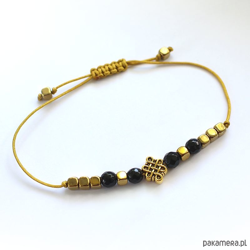 Energetyczna bransoletka wykonana techniką shamballa z chińskim węzłem szczęścia, onyksami fasetowanymi i pozłacanym hematytami wspierająca uzdrawianie wzorca uziemienia, odpowiedzialności, zaradności. Oczyszczona, zregenerowana, napełniona energią czystego światła o najwyższej wibracji. ❤