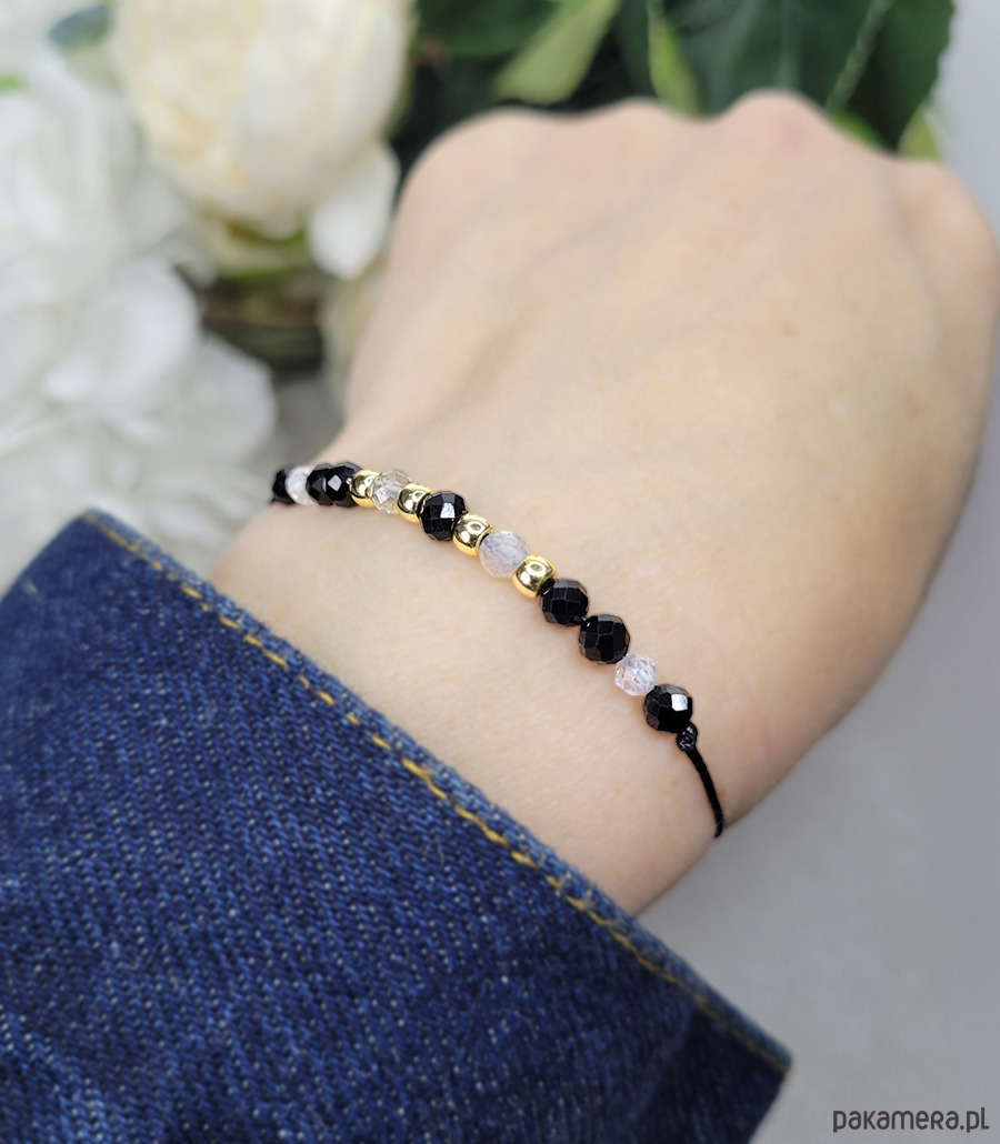 Bransoletka na czarnym sznureczku nylonowym powlekanym - obwód regulowany.