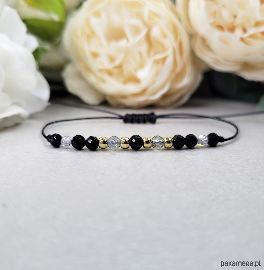 Przepiękna delikatna bransoletka zrobiona z kamieni naturalnych: Turmalinu, Labradorytu, Spinelu i Hematytu w kolorze złota.