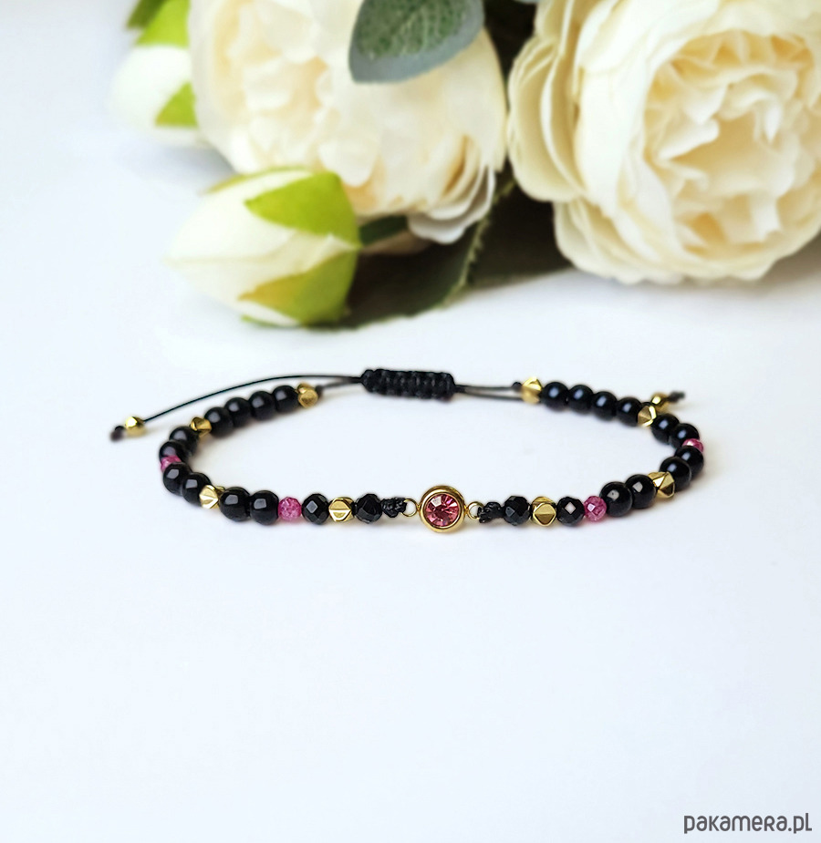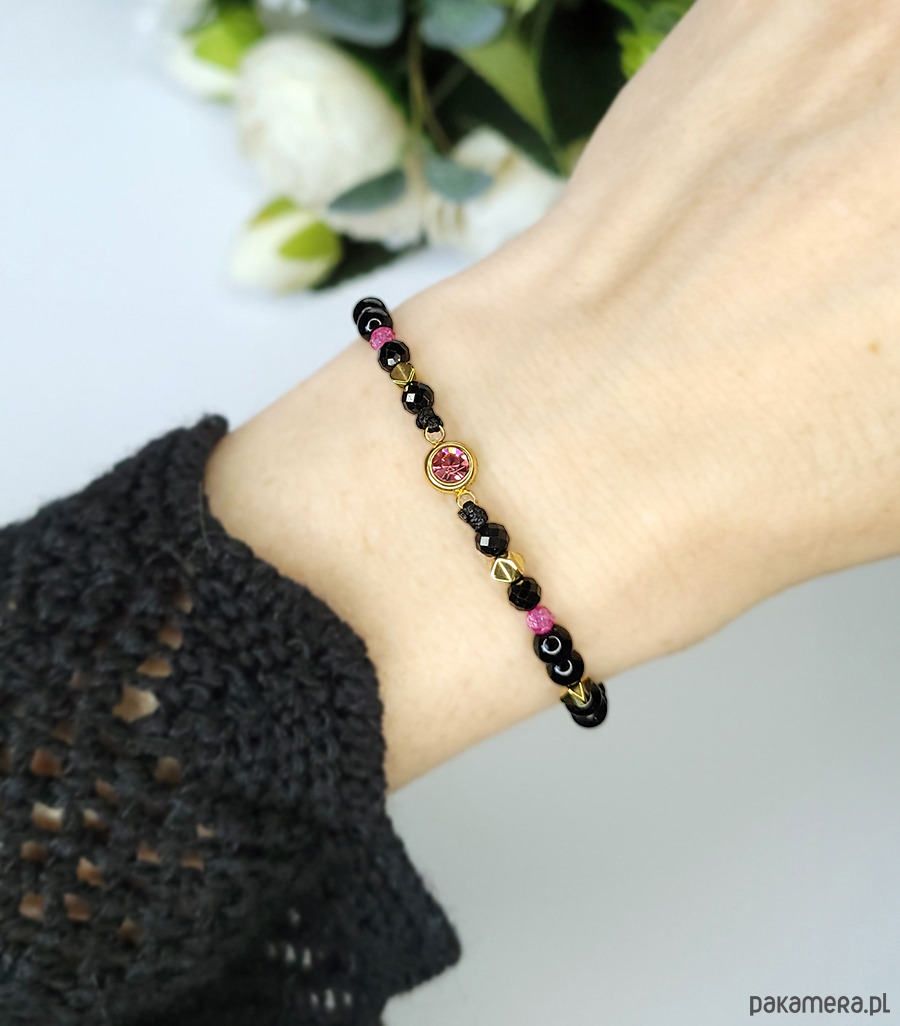 Elegancka bransoletka zrobiona z kamieni naturalnych: Turmalinu, Onyksu, Hematytu w kolorze złota oraz Cyrkonii.