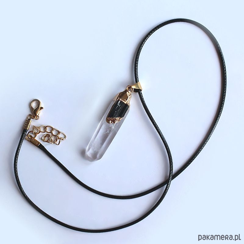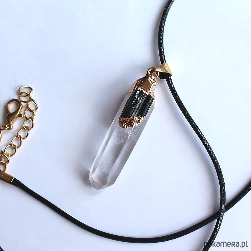 Energetyczny talizman oczyszczający wykonany z kryształu górskiego i surowego czarnego turmalinu w pozłacanej oprawie na czarnym rzemyku z eko skórki. Oczyszczony, zregenerowany, napełniony energią czystego światła o najwyższej wibracji.
