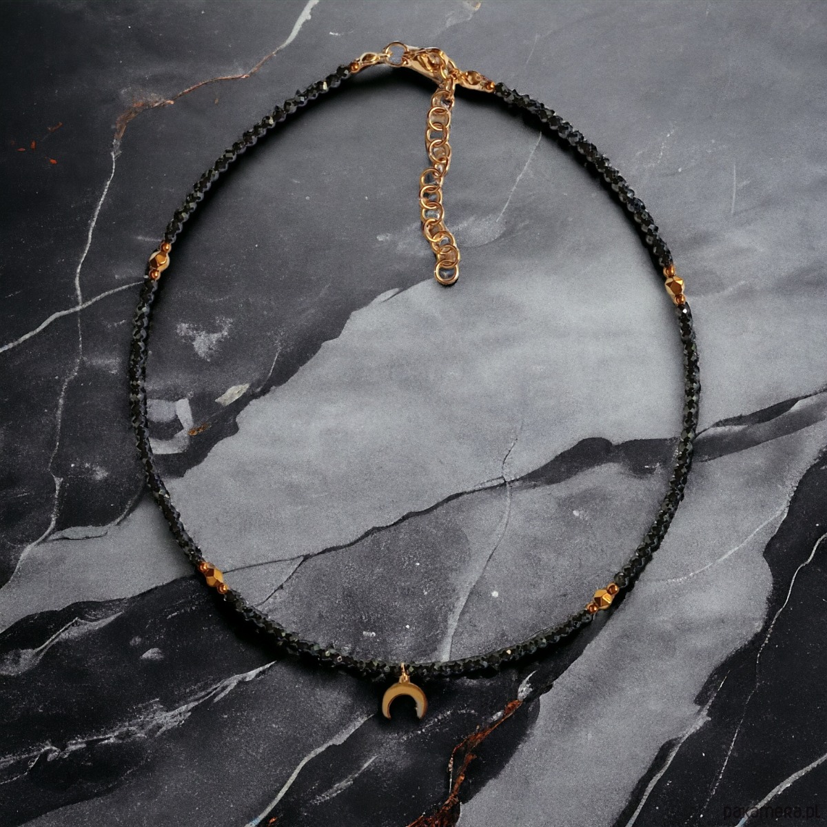 użyte kamienie: czarny turmalin - najsilniejszy kamień ochronny (fasetowane kuleczki 3mm) oraz złoty hematyt 2 i 4mm (przekładki)