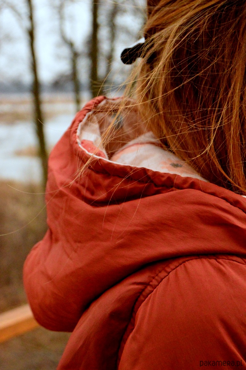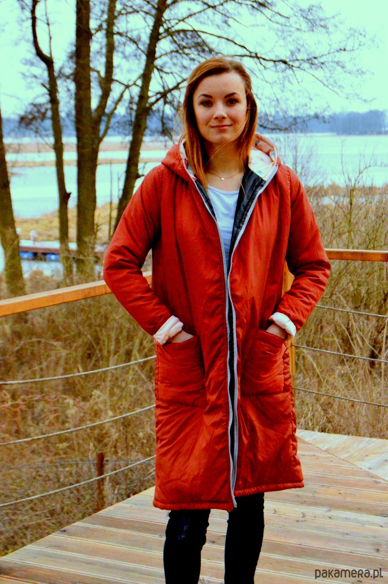 Ocieplana długa z kapturem ruda zapinana na suwak