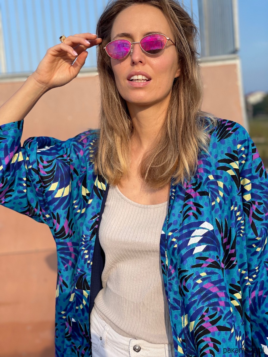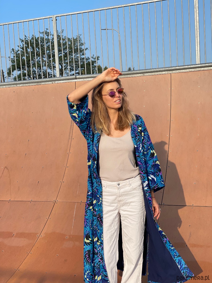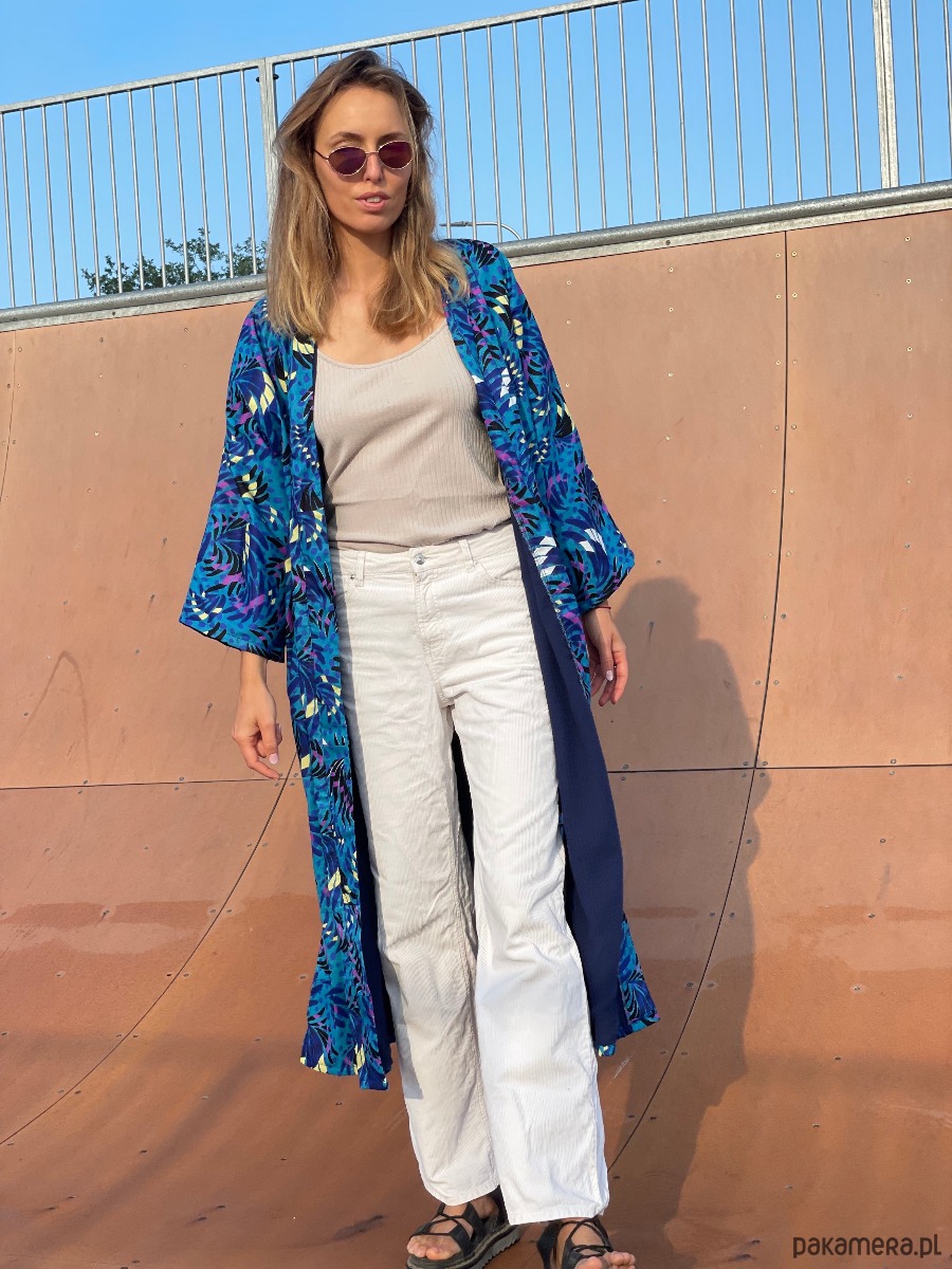 Kimono Blue Savannah to idealny wybór zarówno na letnie spacery, weekendowy relaks, jak i stylowy dodatek do miejskich stylizacji. Noś je z jeansami, szortami lub kostiumem kąpielowym – zawsze doda lekkości, koloru i luksusowego luzu.