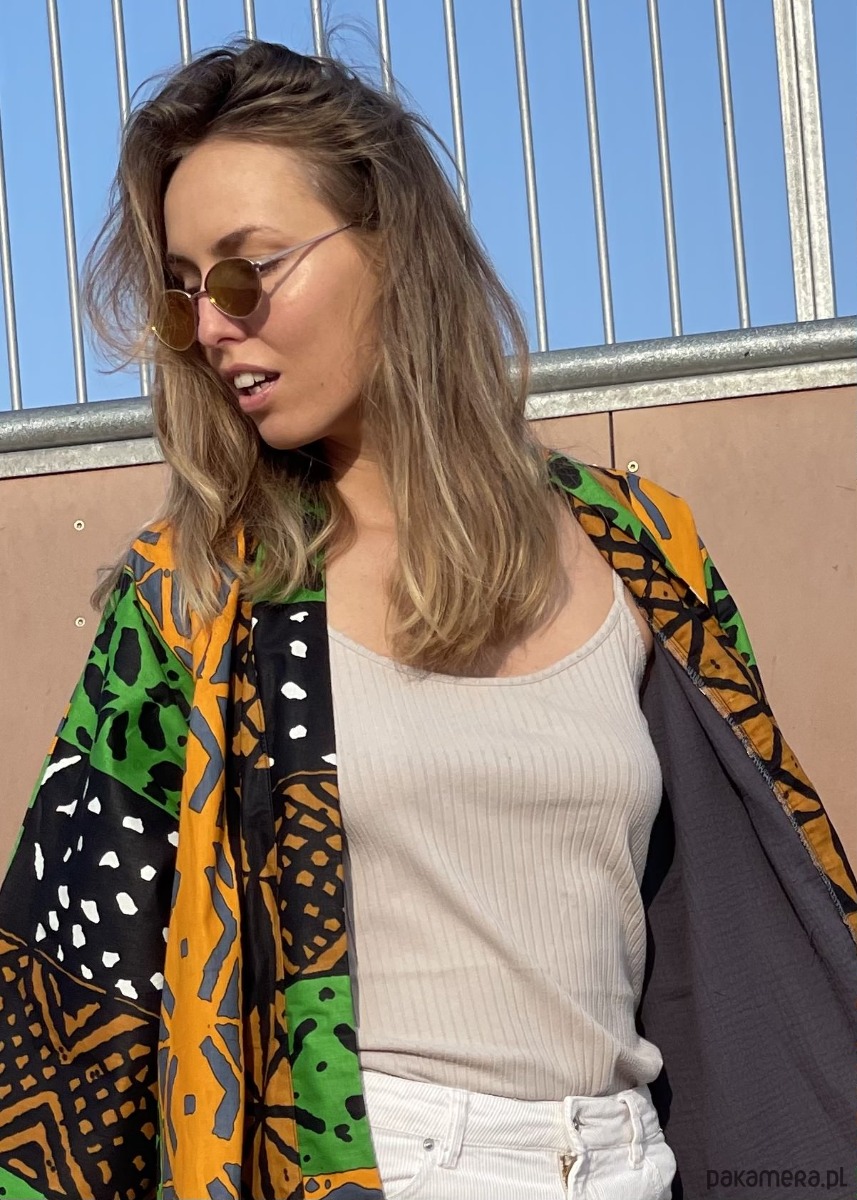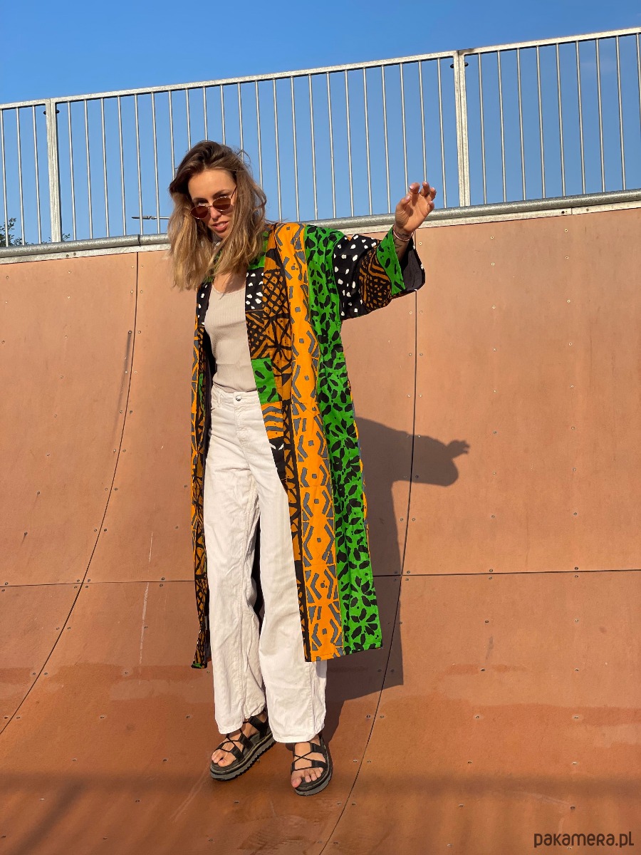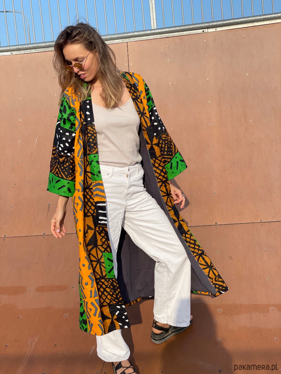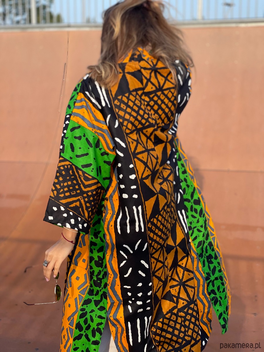 Kimono Makaba to uniseksowy model uszyty z najwyższej jakości bawełnianej tkaniny African Wax. Zachwyca połączeniem intensywnej pomarańczy, głębokiej czerni i świeżej zieleni, tworząc kompozycję o mocnym rytmie.
