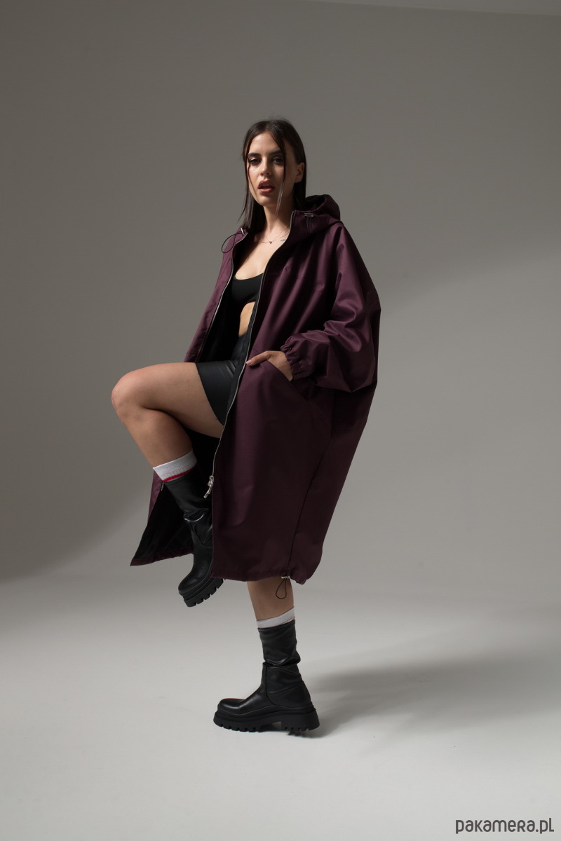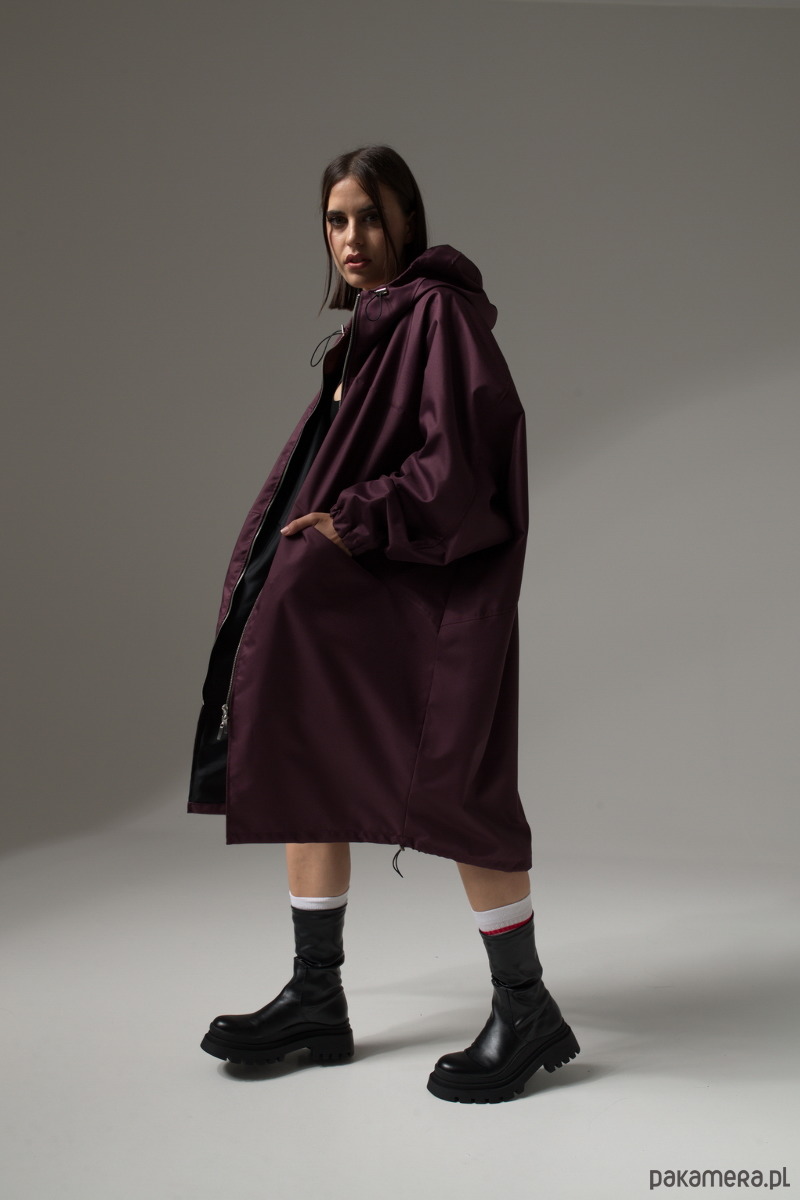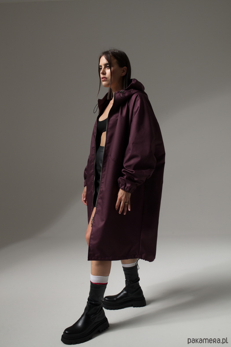 Płaszcz hoodie oversize, uszyty z przeciwdeszczowej tkaniny w kolorze burgundu podszyty ciepłą pikowaną ociepliną w kolorze czarnym ( wersja jesienno zimowa)