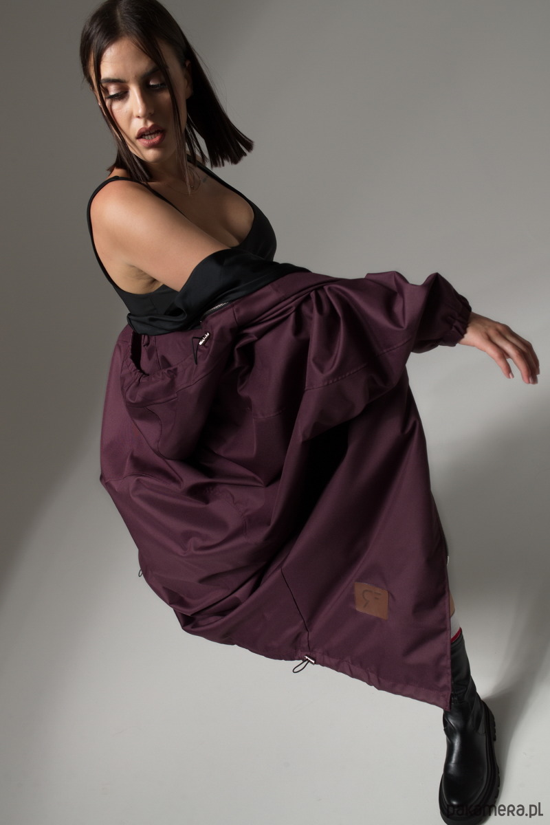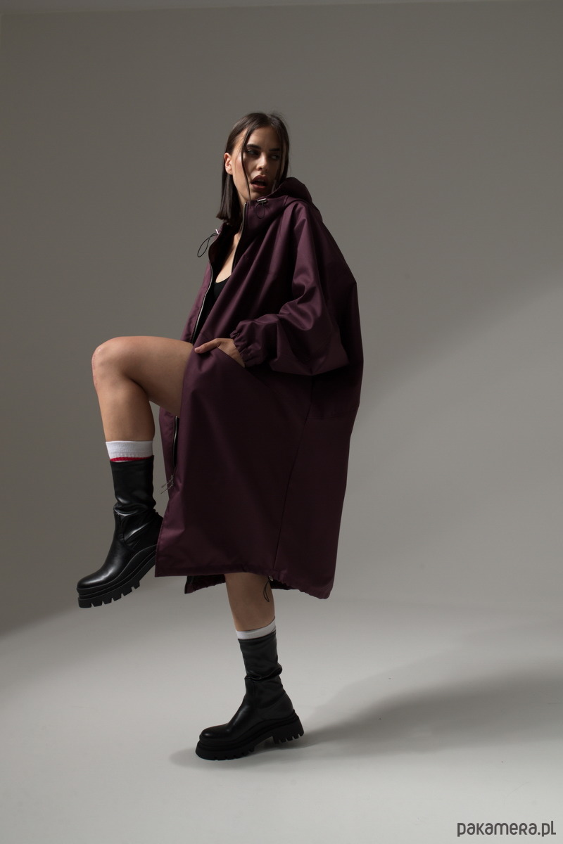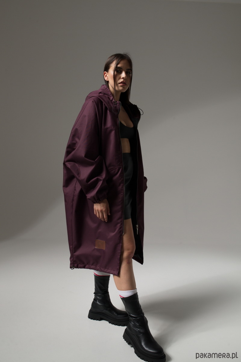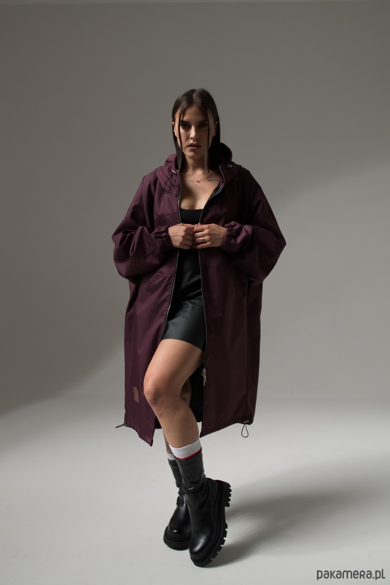 Płaszcz hoodie oversize, uszyty z przeciwdeszczowej tkaniny w kolorze burgundu podszyty ciepłą pikowaną ociepliną w kolorze czarnym ( wersja jesienno zimowa)