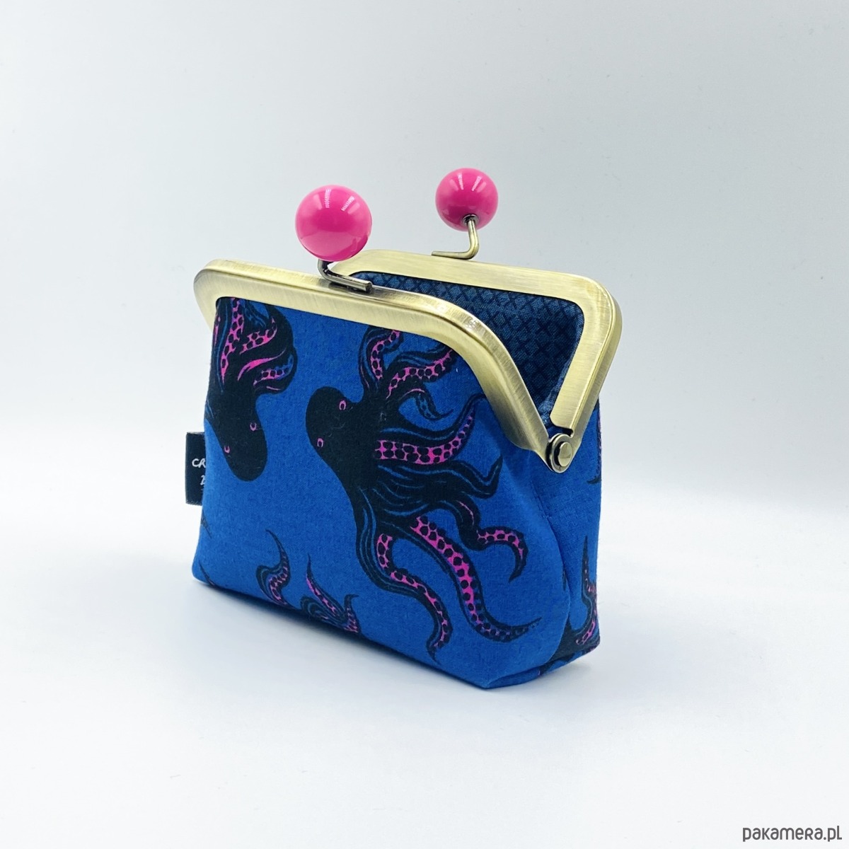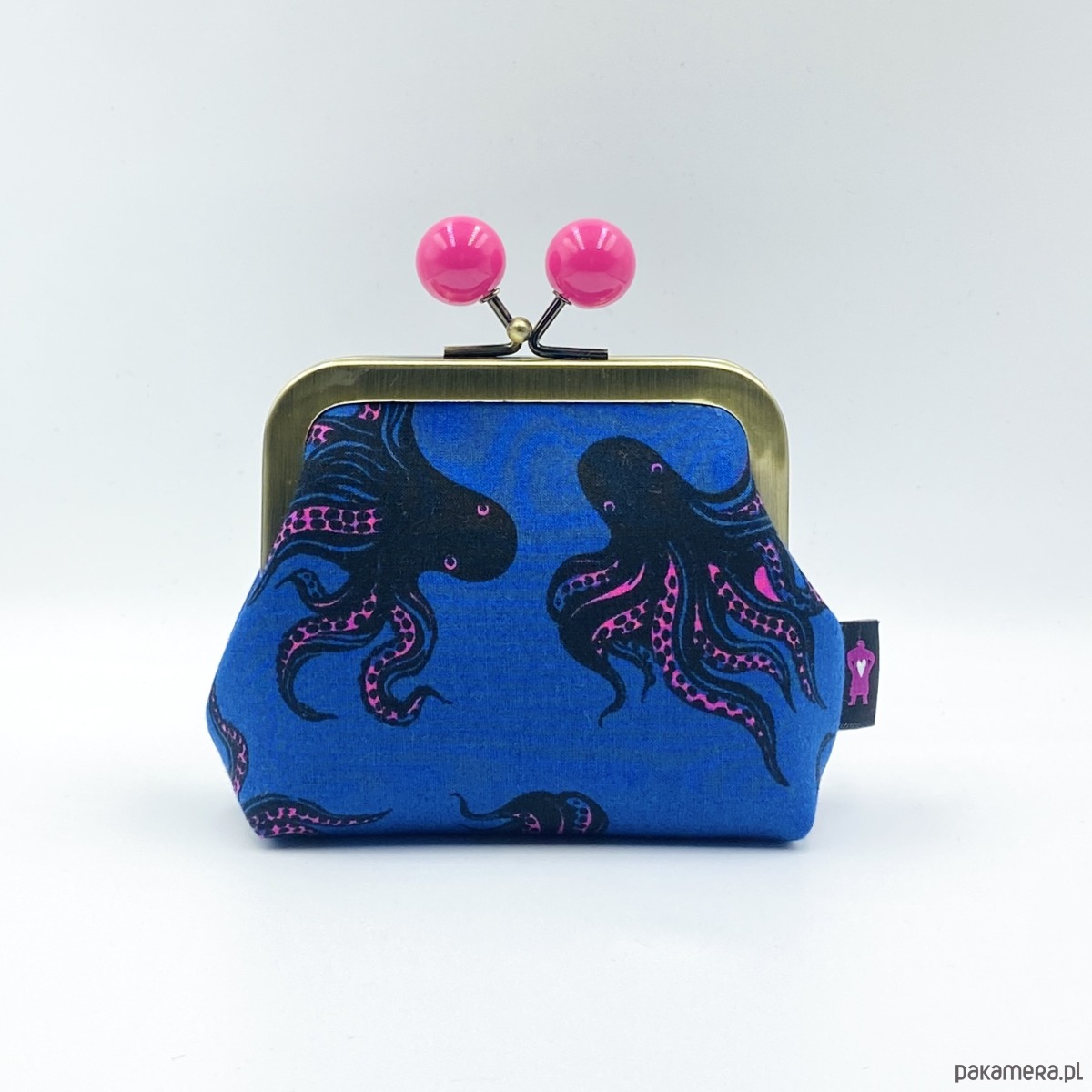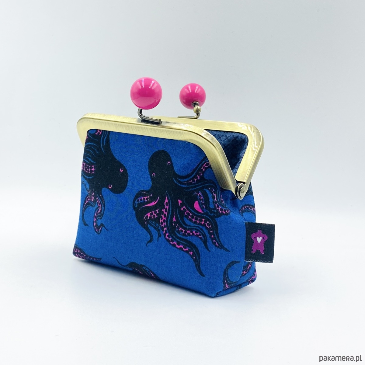 Portmonetka „Octopus Navy” przedstawia czarne ośmiornice na granatowym tle. Warstwa zewnętrzna została wykonana z bawełnianej tkaniny. Wewnętrzna podszewka wykonana została z bawełny w kolorze stalowoszarym w krzyżyki. Jednokomorowa portmonetka, mieści w sobie karty kredytowe.