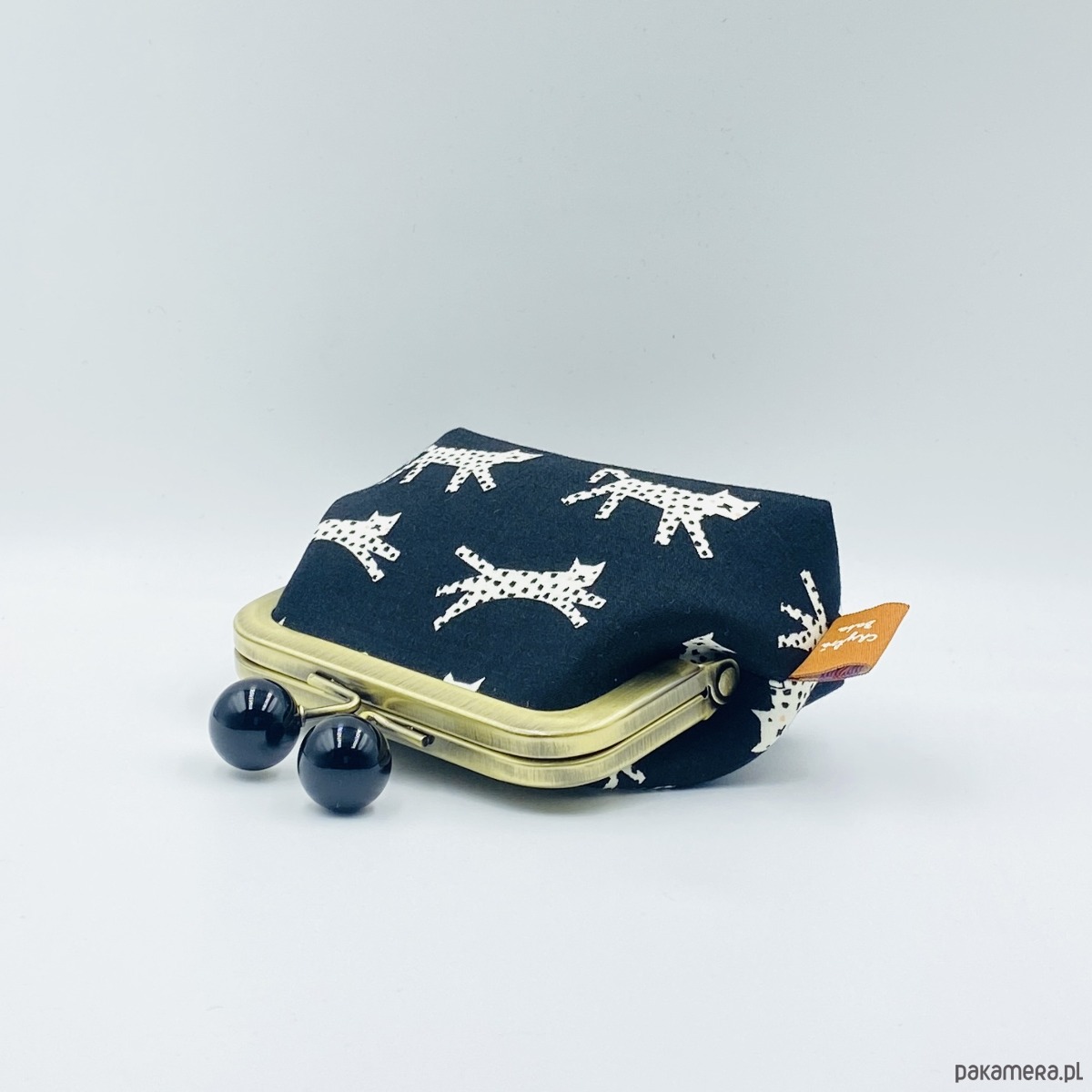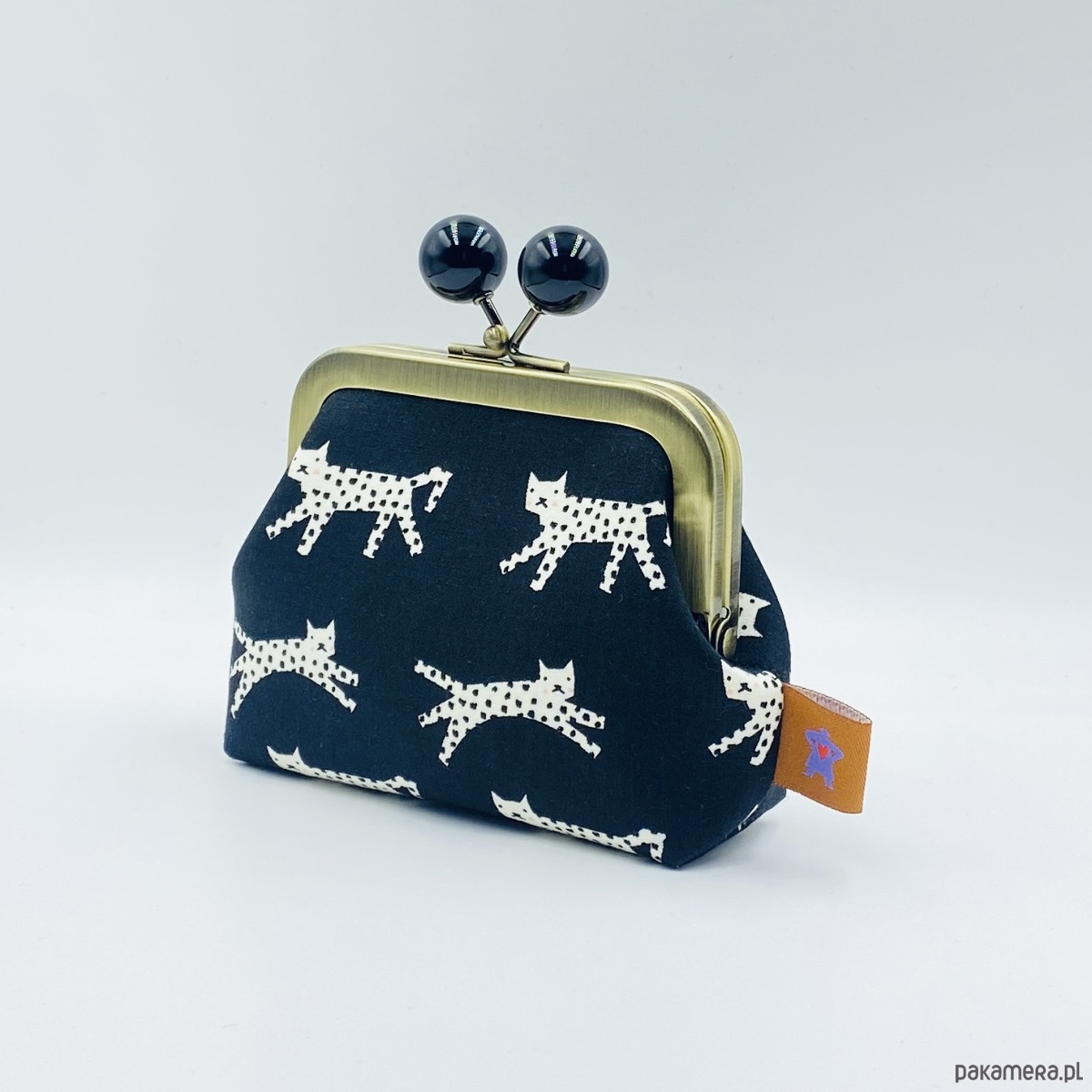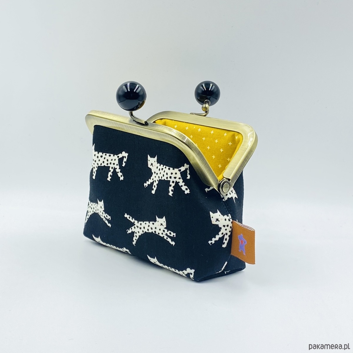 Portmonetka „Cats Blacks” przedstawia białe koty na czarnym tle. Warstwa zewnętrzna została wykonana z bawełnianej tkaniny. Wewnętrzna podszewka wykonana została z bawełny w kolorze żółtym w krzyżyki. Jednokomorowa portmonetka, mieści w sobie karty kredytowe.