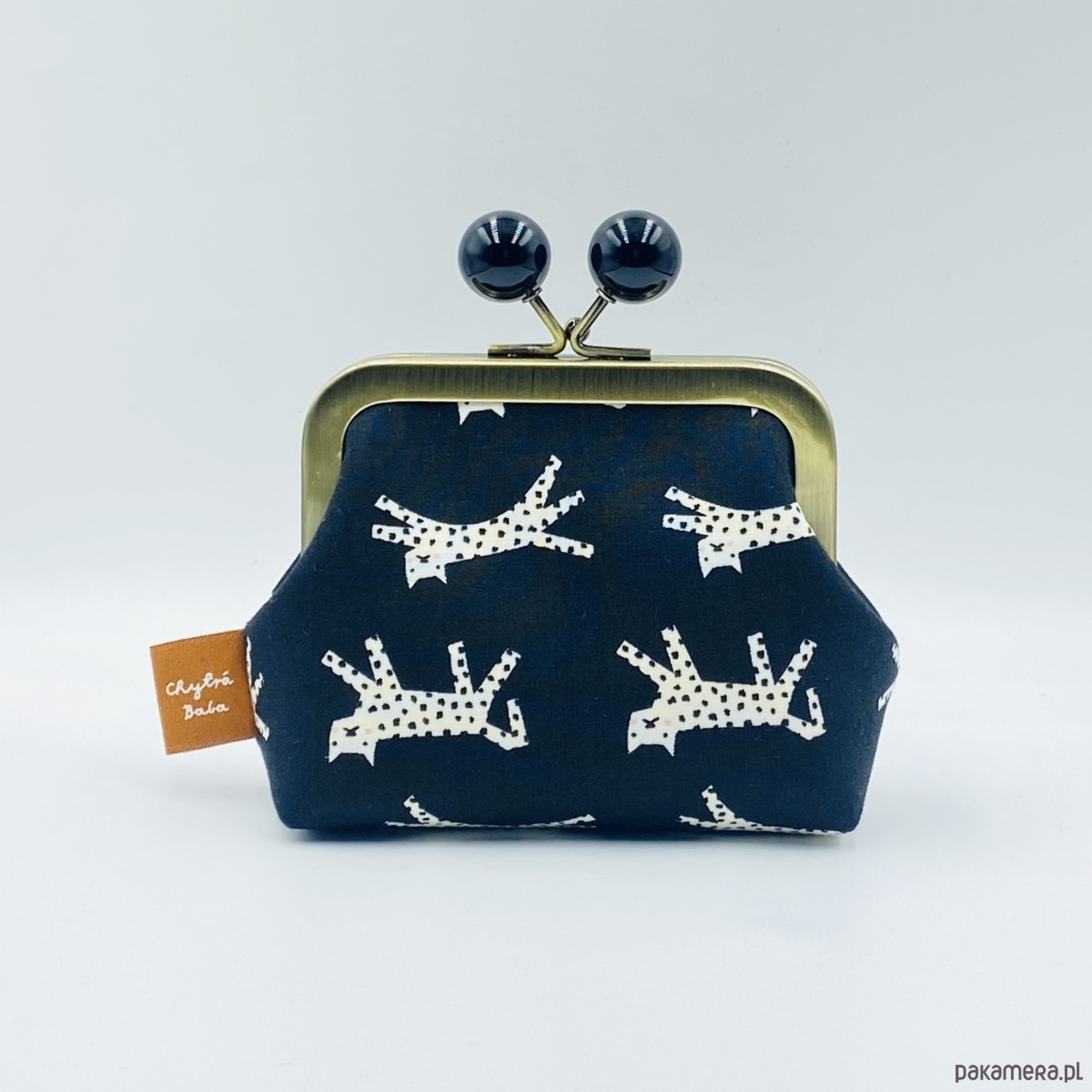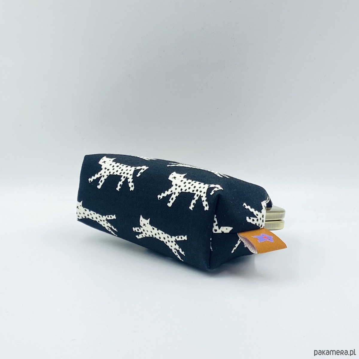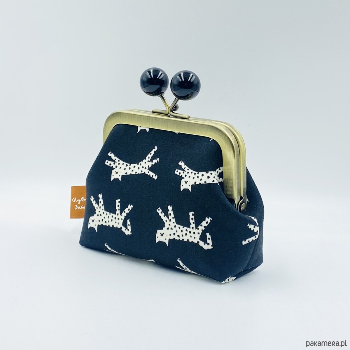 Portmonetka „Cats Blacks” przedstawia białe koty na czarnym tle. Warstwa zewnętrzna została wykonana z bawełnianej tkaniny. Wewnętrzna podszewka wykonana została z bawełny w kolorze żółtym w krzyżyki. Jednokomorowa portmonetka, mieści w sobie karty kredytowe.