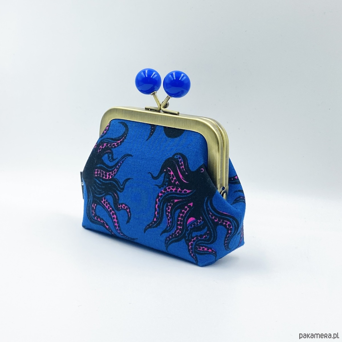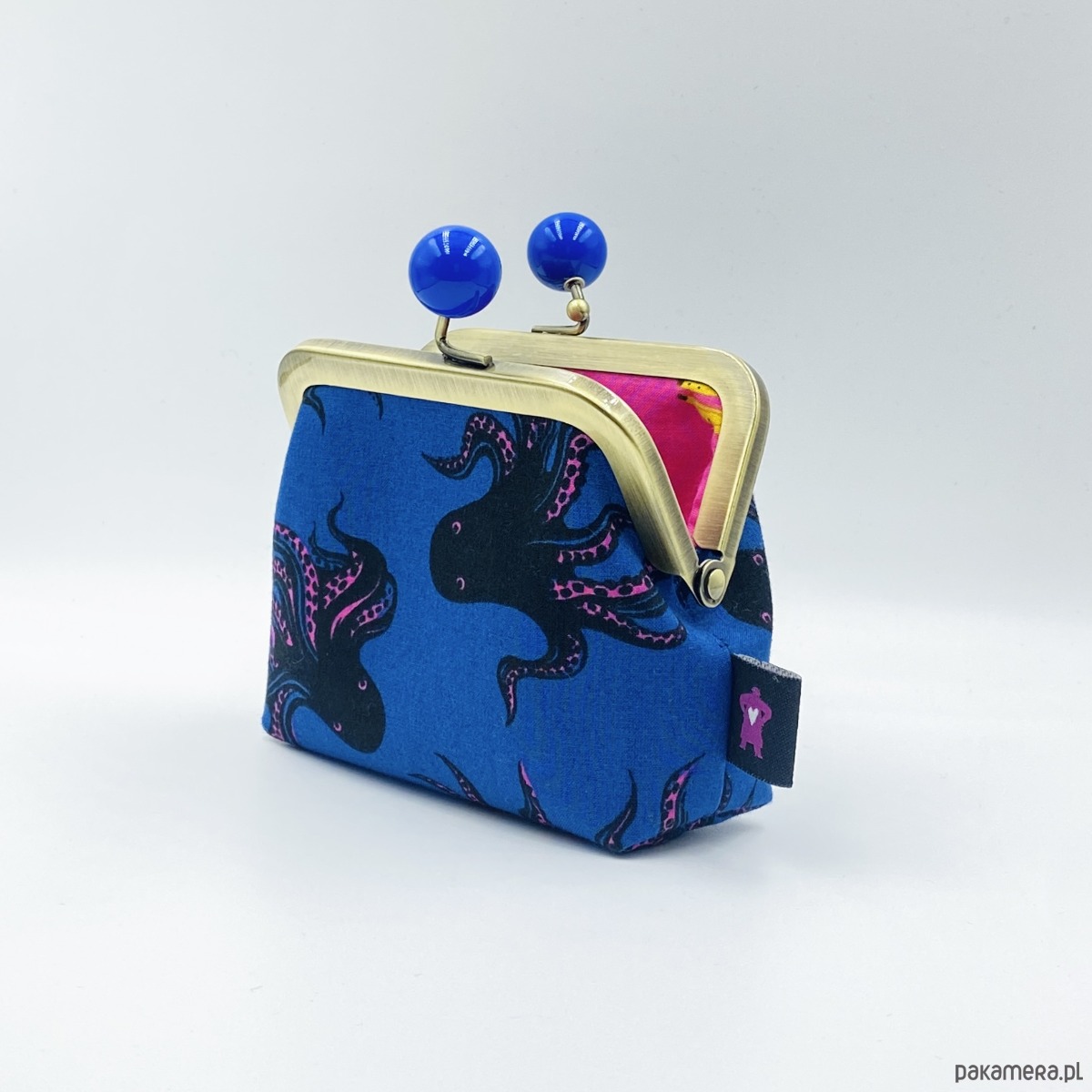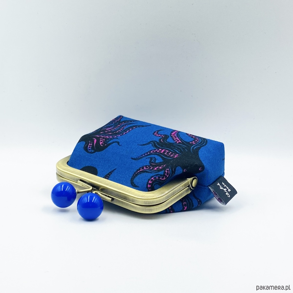 Portmonetka „Octopus Navy” przedstawia czarne ośmiornice na granatowym tle. Warstwa zewnętrzna została wykonana z bawełnianej tkaniny. Wewnętrzna podszewka wykonana została z bawełny w kolorze stalowoszarym w krzyżyki. Jednokomorowa portmonetka, mieści w sobie karty kredytowe.