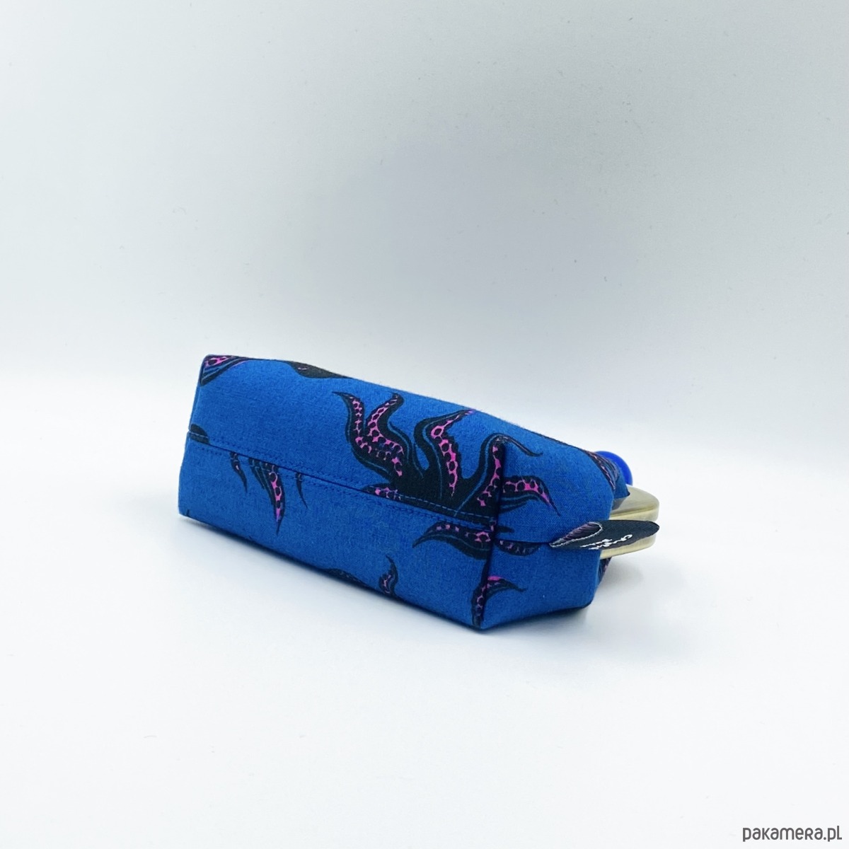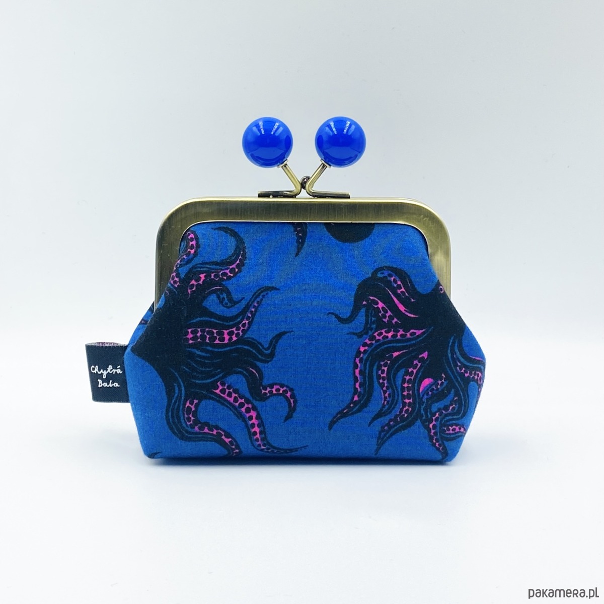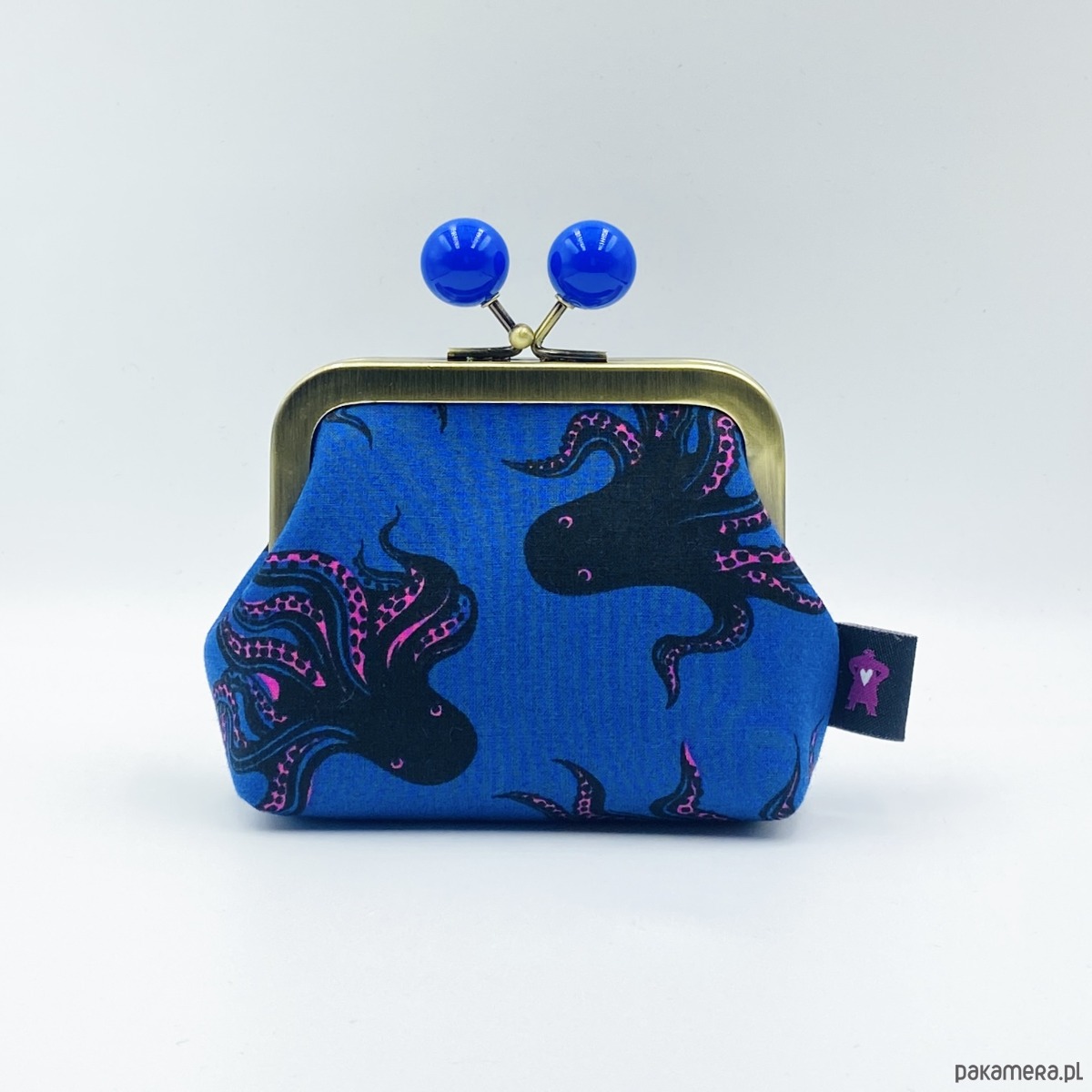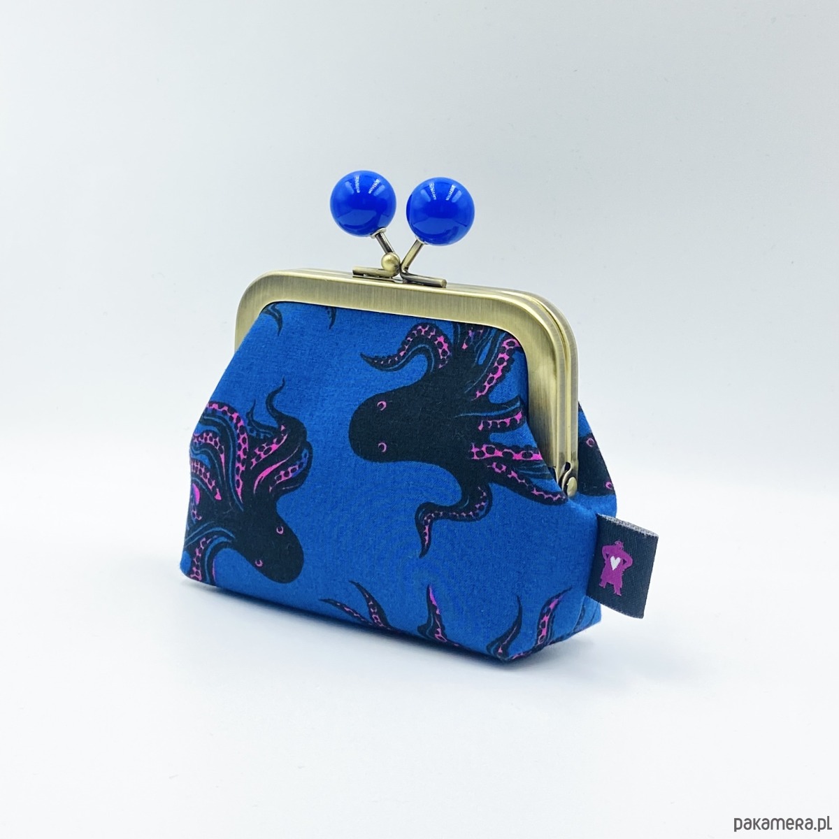 Portmonetka „Octopus Navy” przedstawia czarne ośmiornice na granatowym tle. Warstwa zewnętrzna została wykonana z bawełnianej tkaniny. Wewnętrzna podszewka wykonana została z bawełny w kolorze stalowoszarym w krzyżyki. Jednokomorowa portmonetka, mieści w sobie karty kredytowe.
