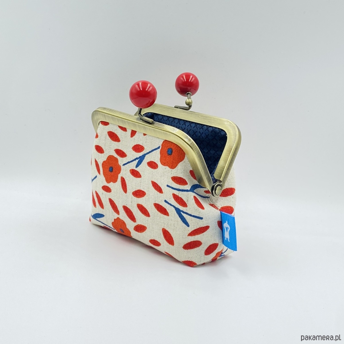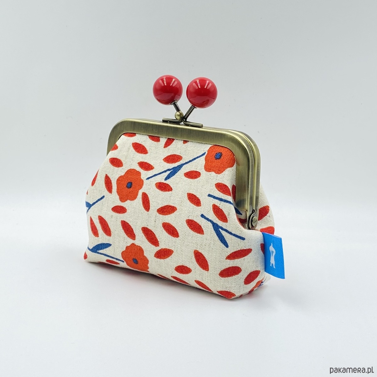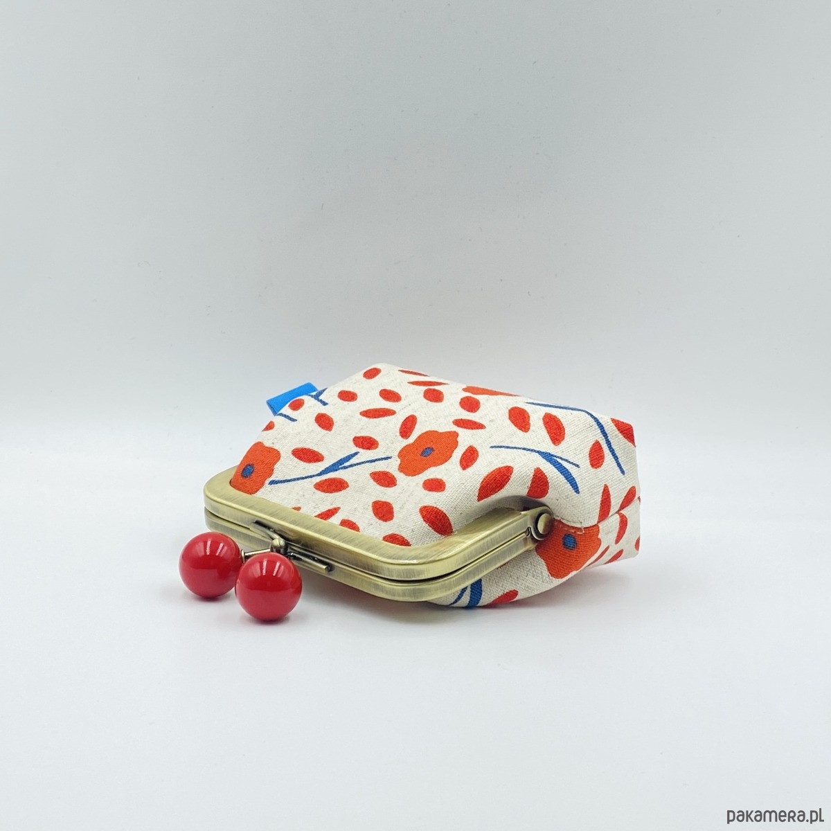 Portmonetka „Poppies Red” przedstawia drobne kwiatki maków z niebieskimi liśćmi na bielonym płótnie. Warstwa zewnętrzna została wykonana z bawełnianego płótna. Wewnętrzna podszewka wykonana została z bawełny w kolorze stalowoszarym w krzyżyki. Jednokomorowa portmonetka, mieści w sobie karty kredytowe.