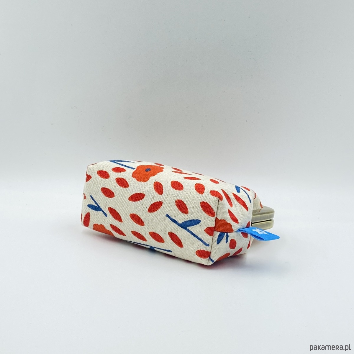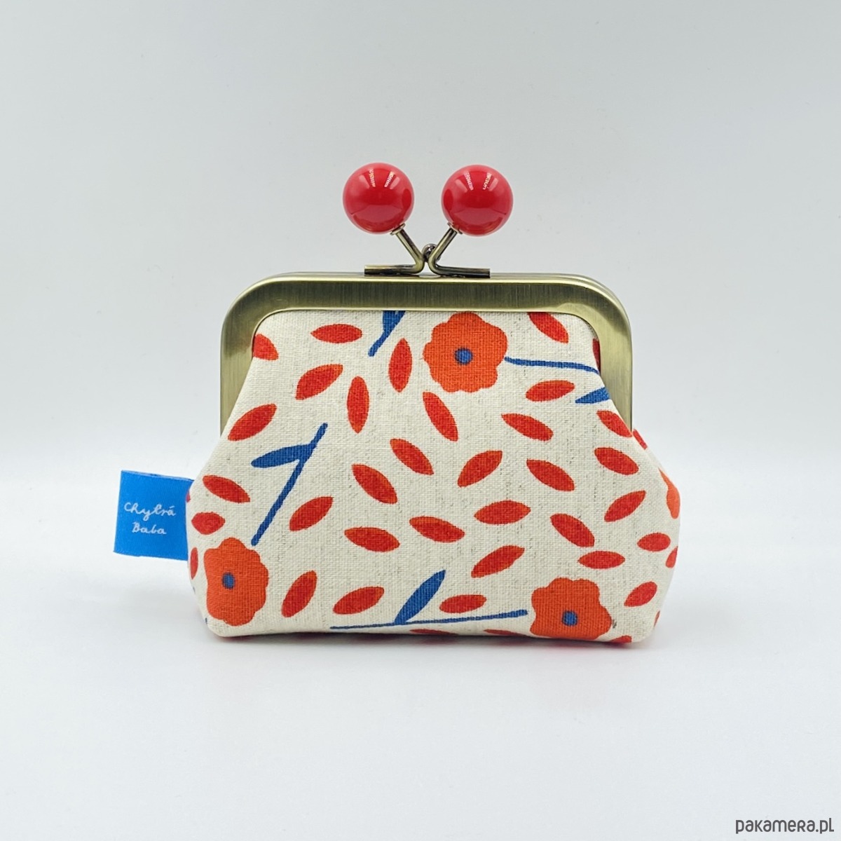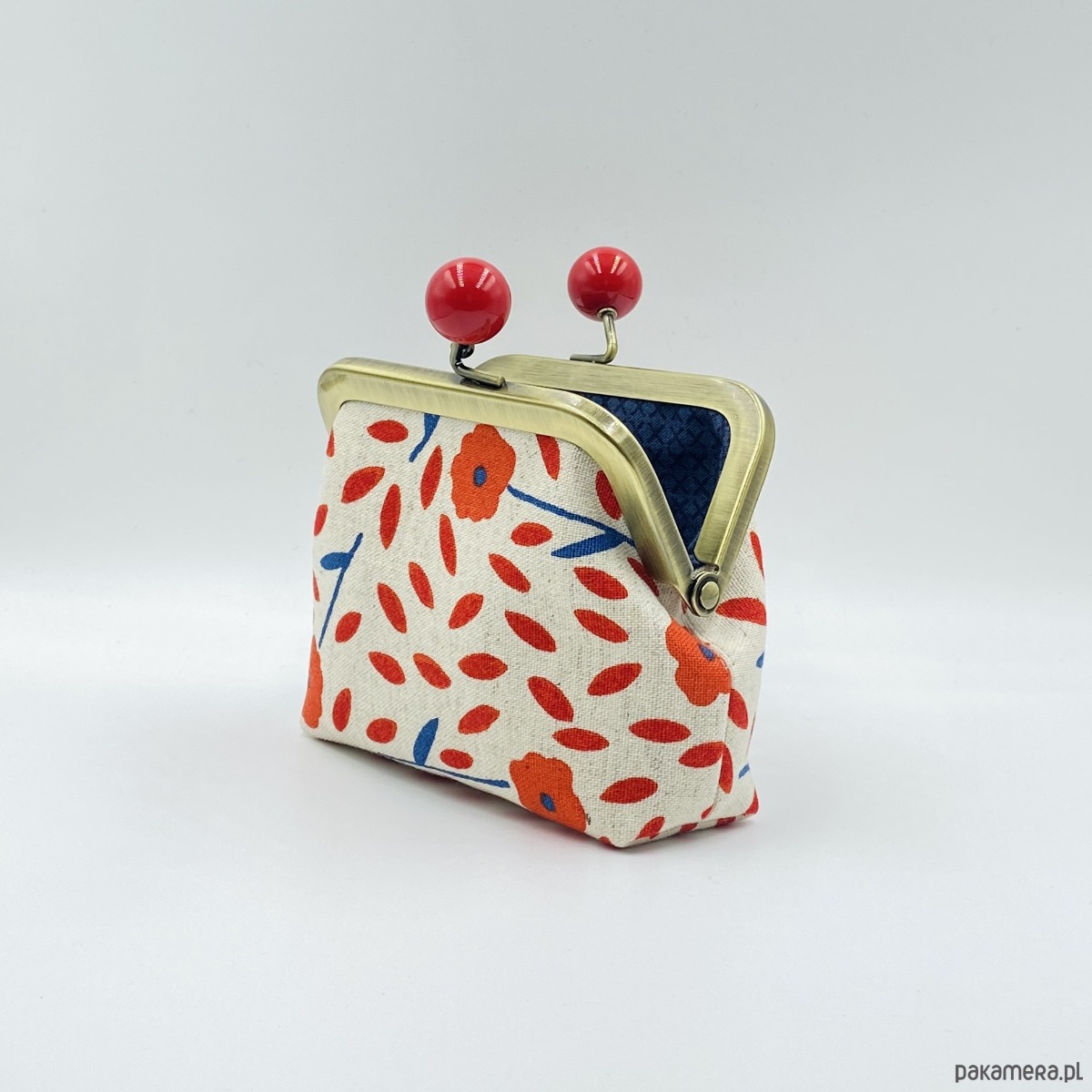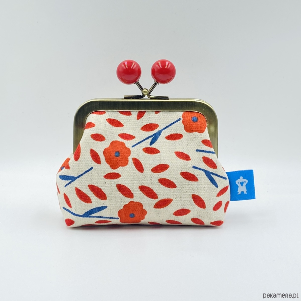 Portmonetka „Poppies Red” przedstawia drobne kwiatki maków z niebieskimi liśćmi na bielonym płótnie. Warstwa zewnętrzna została wykonana z bawełnianego płótna. Wewnętrzna podszewka wykonana została z bawełny w kolorze stalowoszarym w krzyżyki. Jednokomorowa portmonetka, mieści w sobie karty kredytowe.