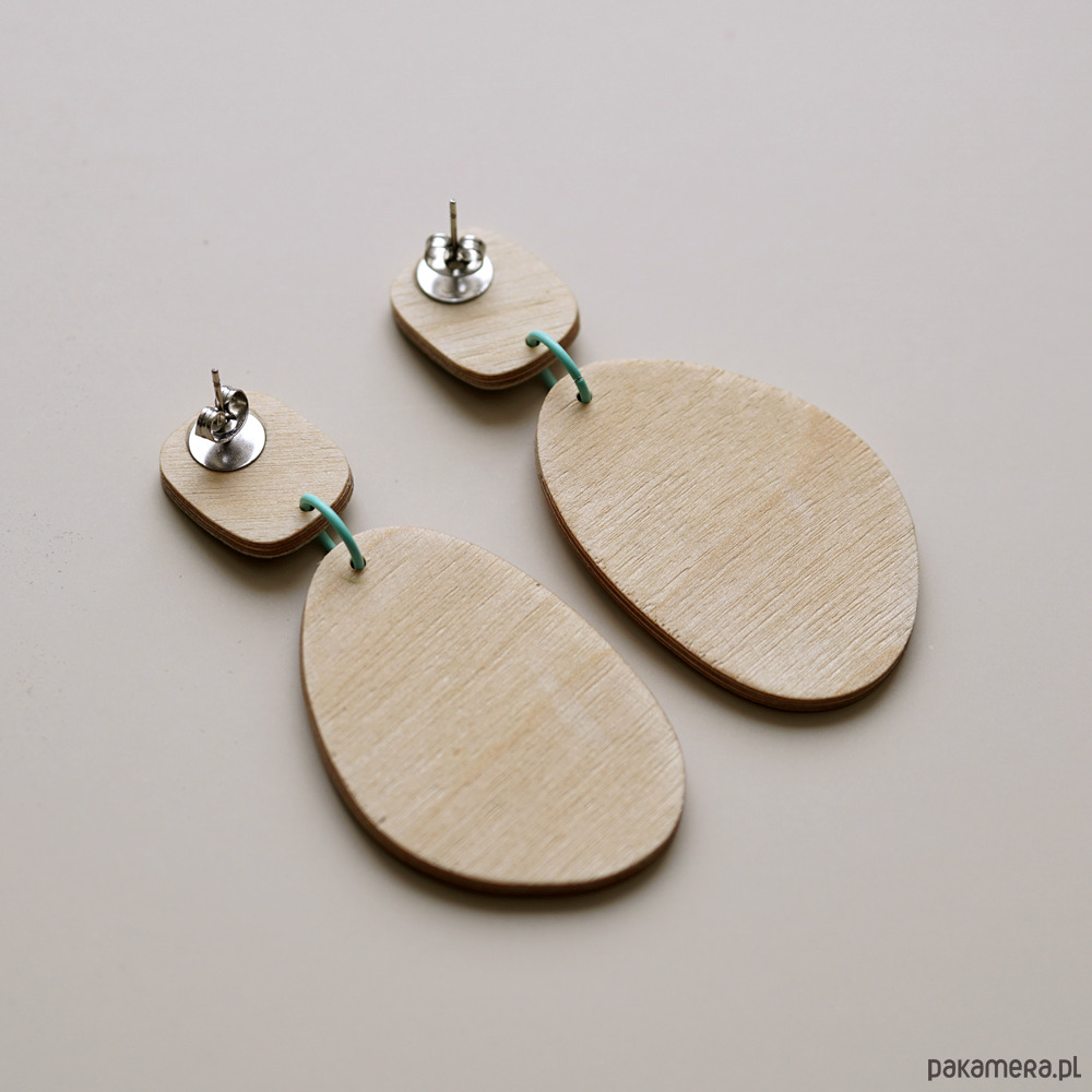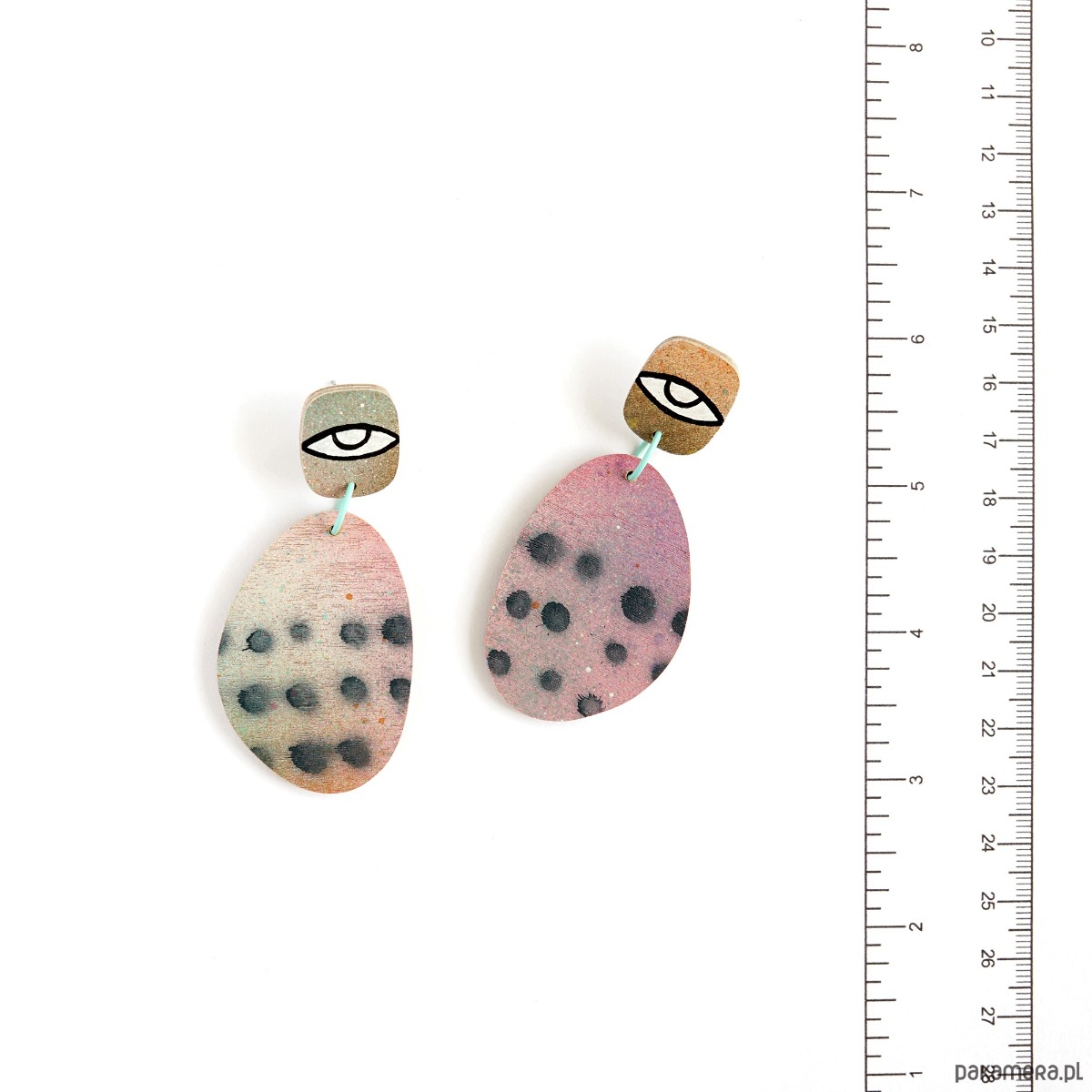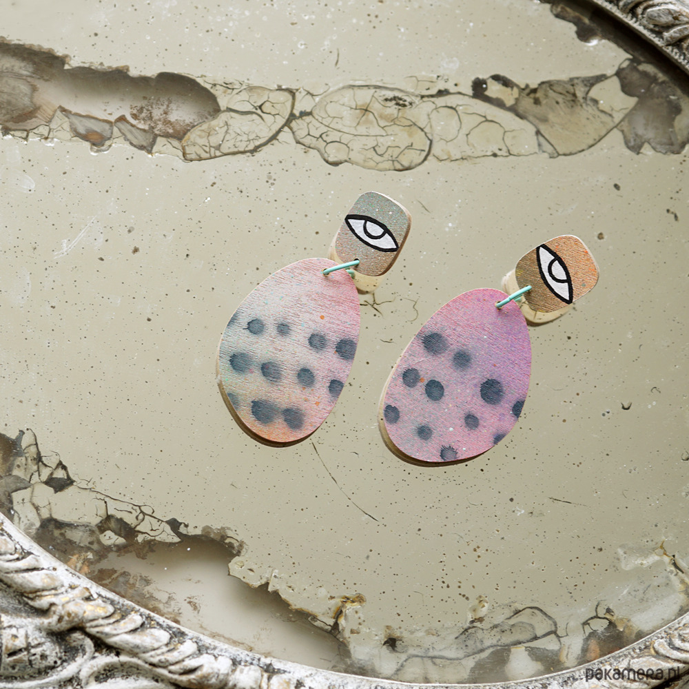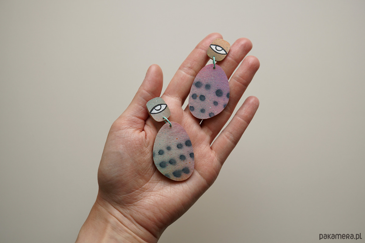 Oczęta to wyjątkowe, imponujące i zupełnie unikatowe kolczyki, od początku do końca stworzone w mojej pracowni. W przeciwieństwie do większości dostępnej biżuterii drewnianej, ta nie została wycięta laserowo, ale ręcznie przeze mnie. Udało mi się w ten sposób uniknąć spalonych, brązowych krawędzi; zrobiłam też krok w tył od produkcji bliższej masowej w kierunku rękodzieła w pełnym tego słowa znaczeniu. Wahacze zostały również dokładnie oszlifowane, aby ich kształt był dokładnie taki, jak zaplanowałam.