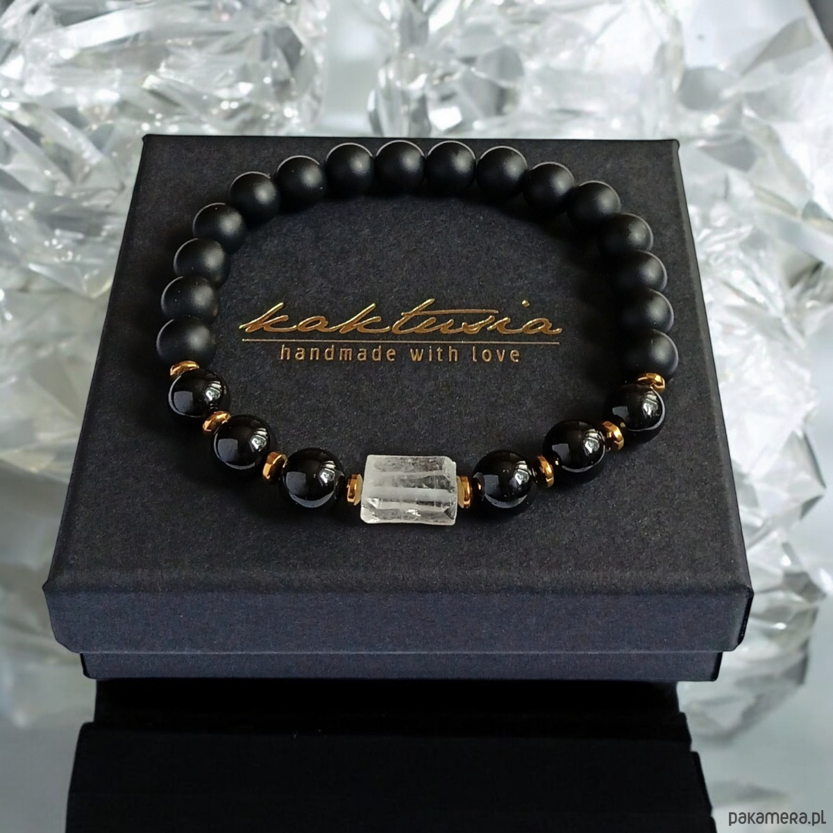 niezwykle ciekawa bransoletka- talizman wykonana z surowej bryłki kryształu górskiego, matowego onyksu (8mm), czarnego turmalinu (połysk, 8mm), przekładek ze złotego hematytu.