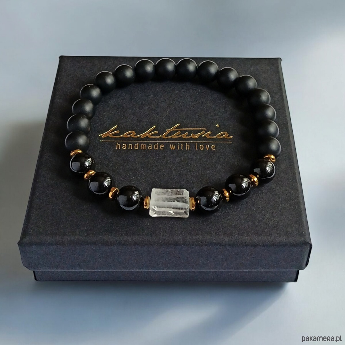 niezwykle ciekawa bransoletka- talizman wykonana z surowej bryłki kryształu górskiego, matowego onyksu (8mm), czarnego turmalinu (połysk, 8mm), przekładek ze złotego hematytu.