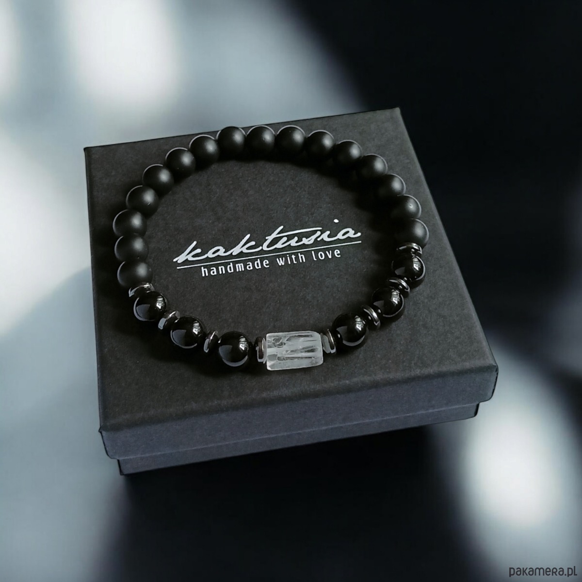 niezwykle ciekawa bransoletka- talizman wykonana z surowej bryłki kryształu górskiego, matowego onyksu (8mm), czarnego turmalinu (połysk, 8mm), przekładek z grafitowego hematytu
