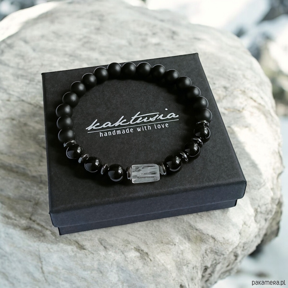 niezwykle ciekawa bransoletka- talizman wykonana z surowej bryłki kryształu górskiego, matowego onyksu (8mm), czarnego turmalinu (połysk, 8mm), przekładek z grafitowego hematytu