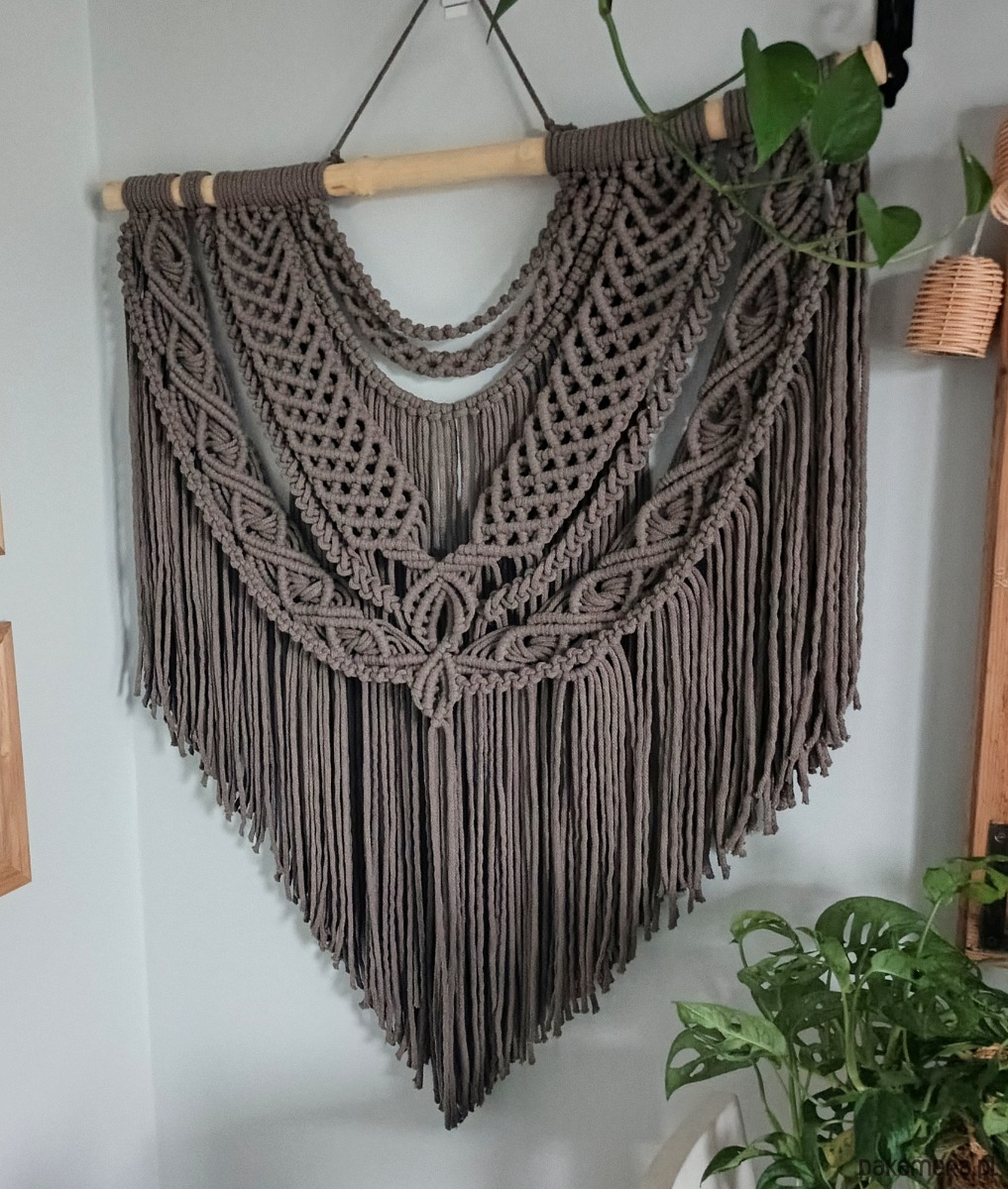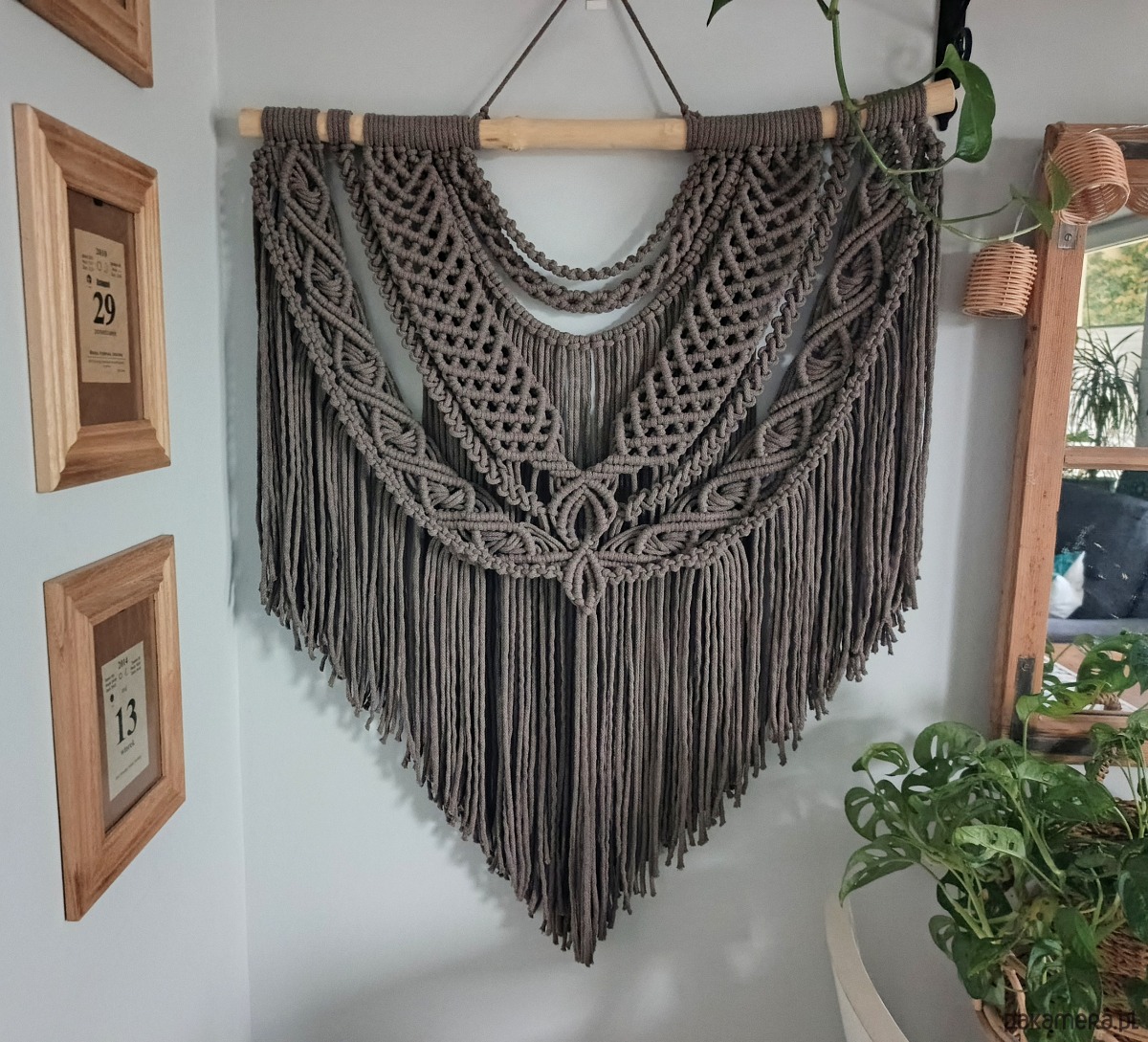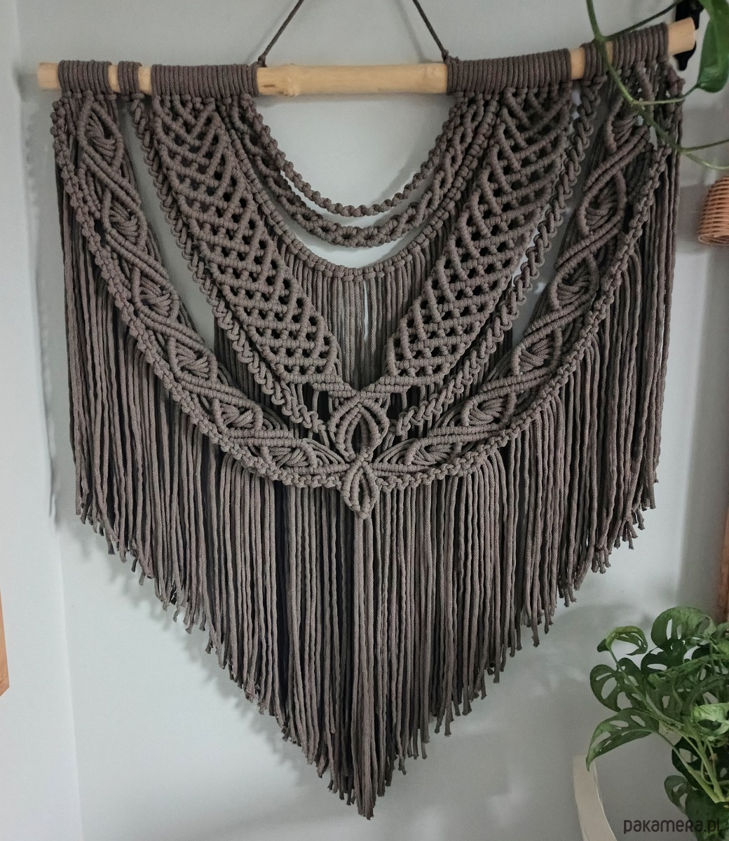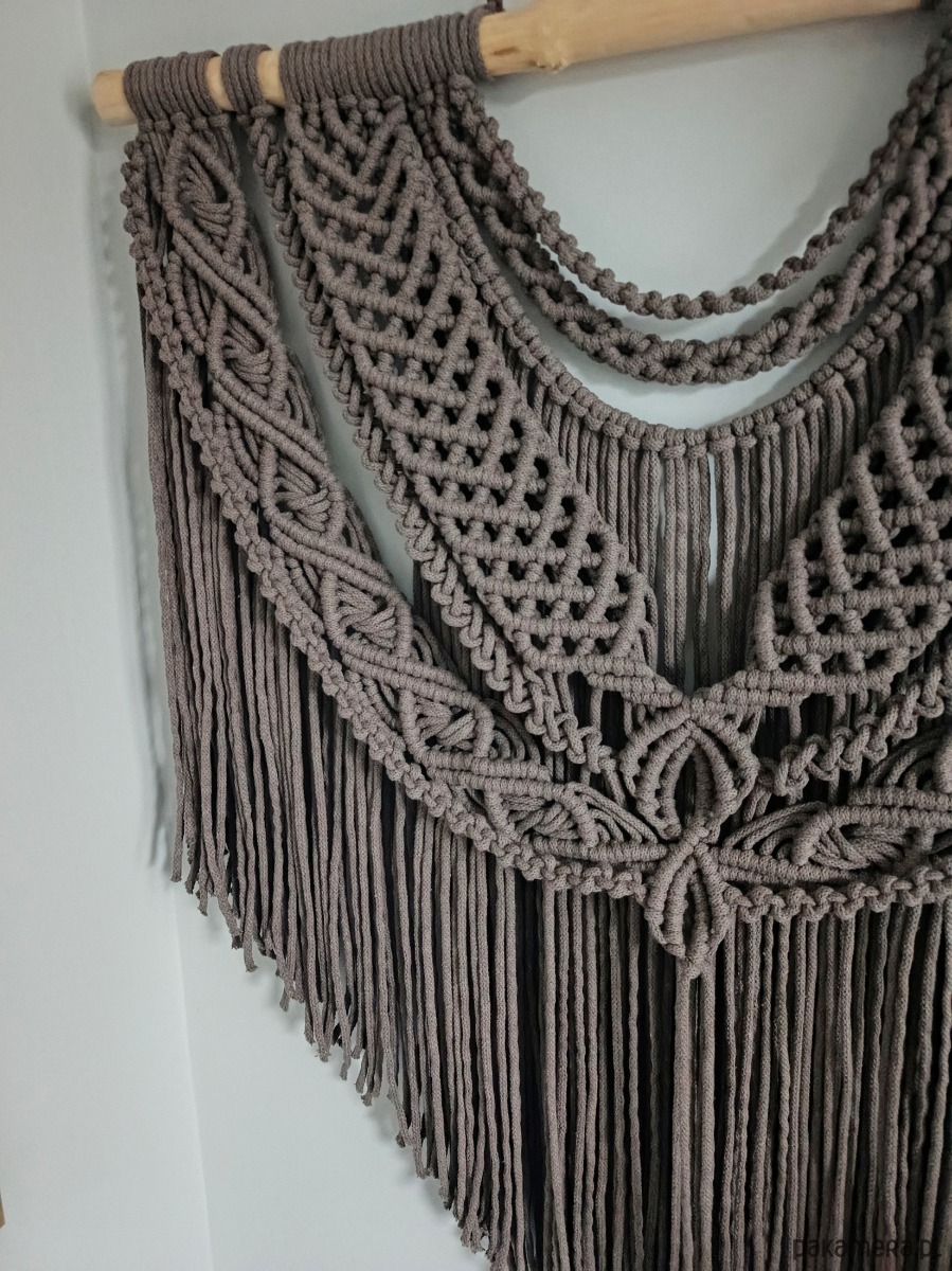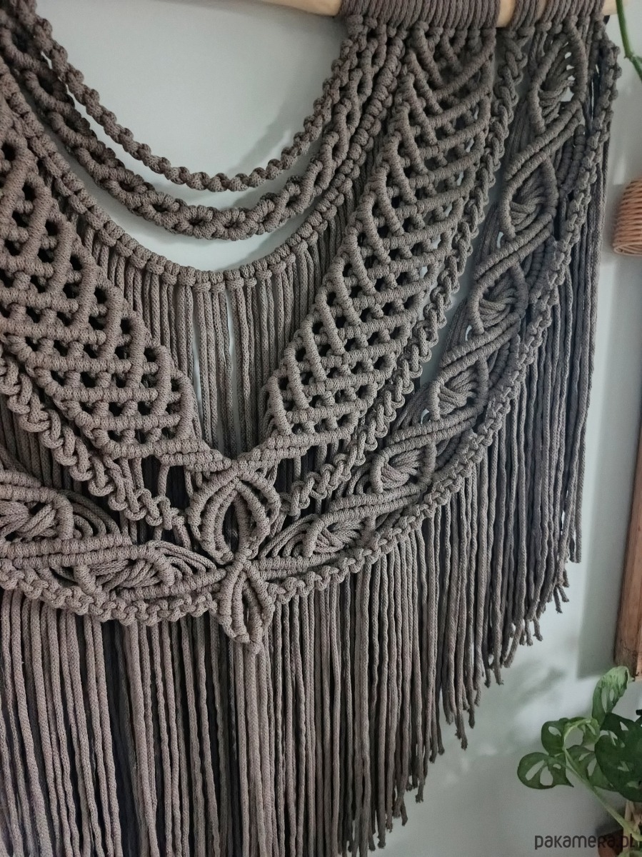 Bachata wykonana jest na naturalnej gałęzi, ze sznurka bawełnianego 5 mm w kolorze chłodnego beżu. Co ważne, rdzeń sznurka jest dokładnie w kolorze sznurka, więc dół makramy jest jednolity kolorystycznie, a co za tym idzie- efekt końcowy jest dużo bardziej estetyczny.