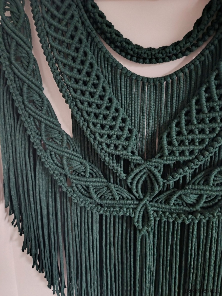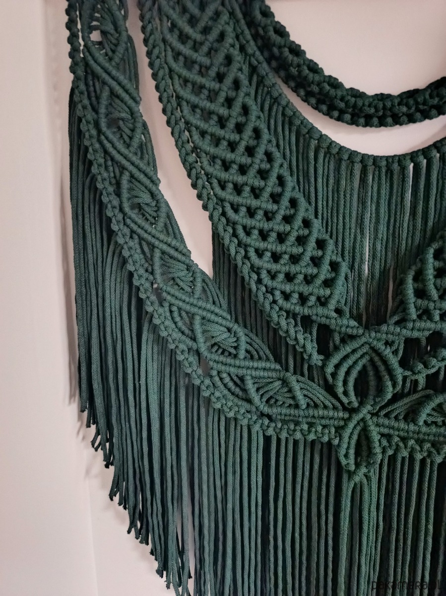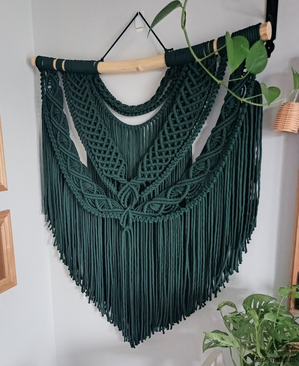 Bachata wykonana jest na naturalnej gałęzi, ze sznurka bawełnianego 5 mm w kolorze chłodnego butelkowej zieleni. Co ważne, rdzeń sznurka jest dokładnie w kolorze sznurka, więc dół makramy jest jednolity kolorystycznie, a co za tym idzie- efekt końcowy jest dużo bardziej estetyczny.