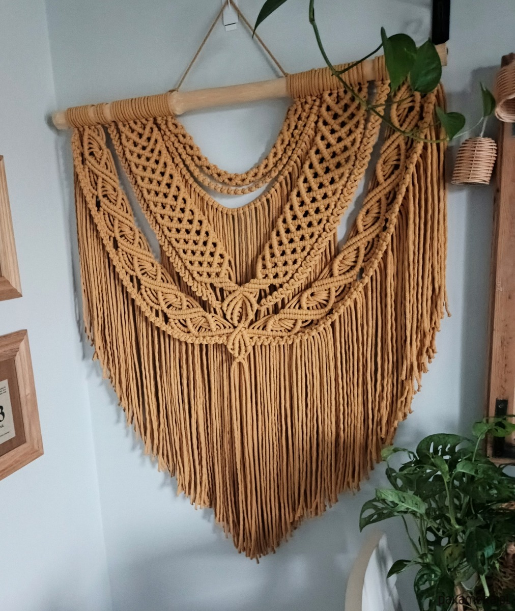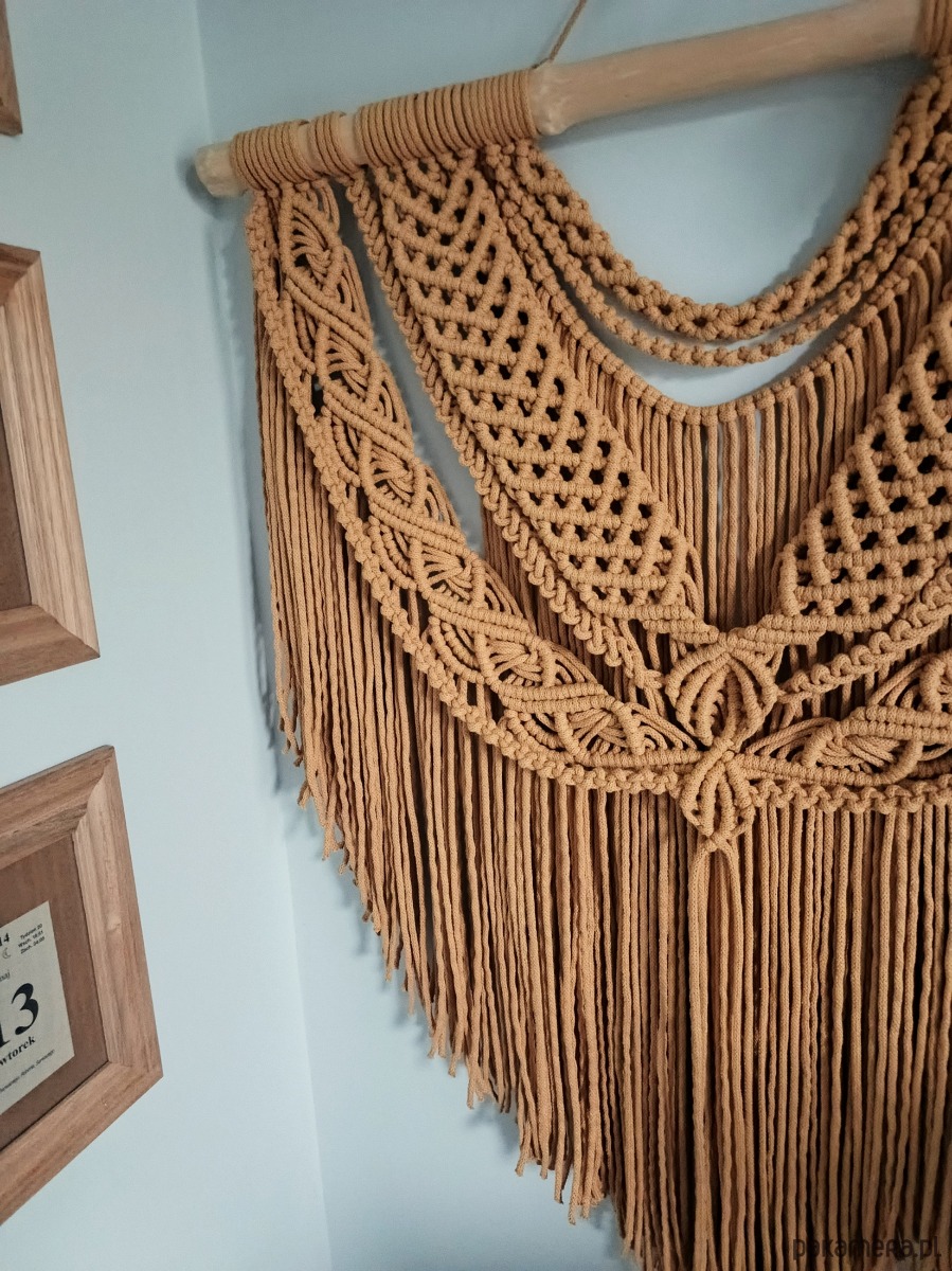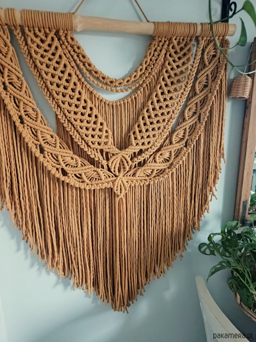 Bachata wykonana jest na naturalnej gałęzi, ze sznurka bawełnianego 5 mm w kolorze musztardowym. Co ważne, rdzeń sznurka jest dokładnie w kolorze sznurka, więc dół makramy jest jednolity kolorystycznie, a co za tym idzie- efekt końcowy jest dużo bardziej estetyczny.