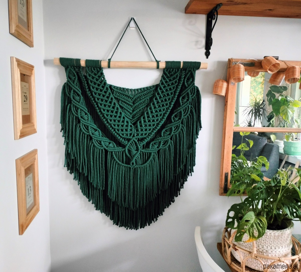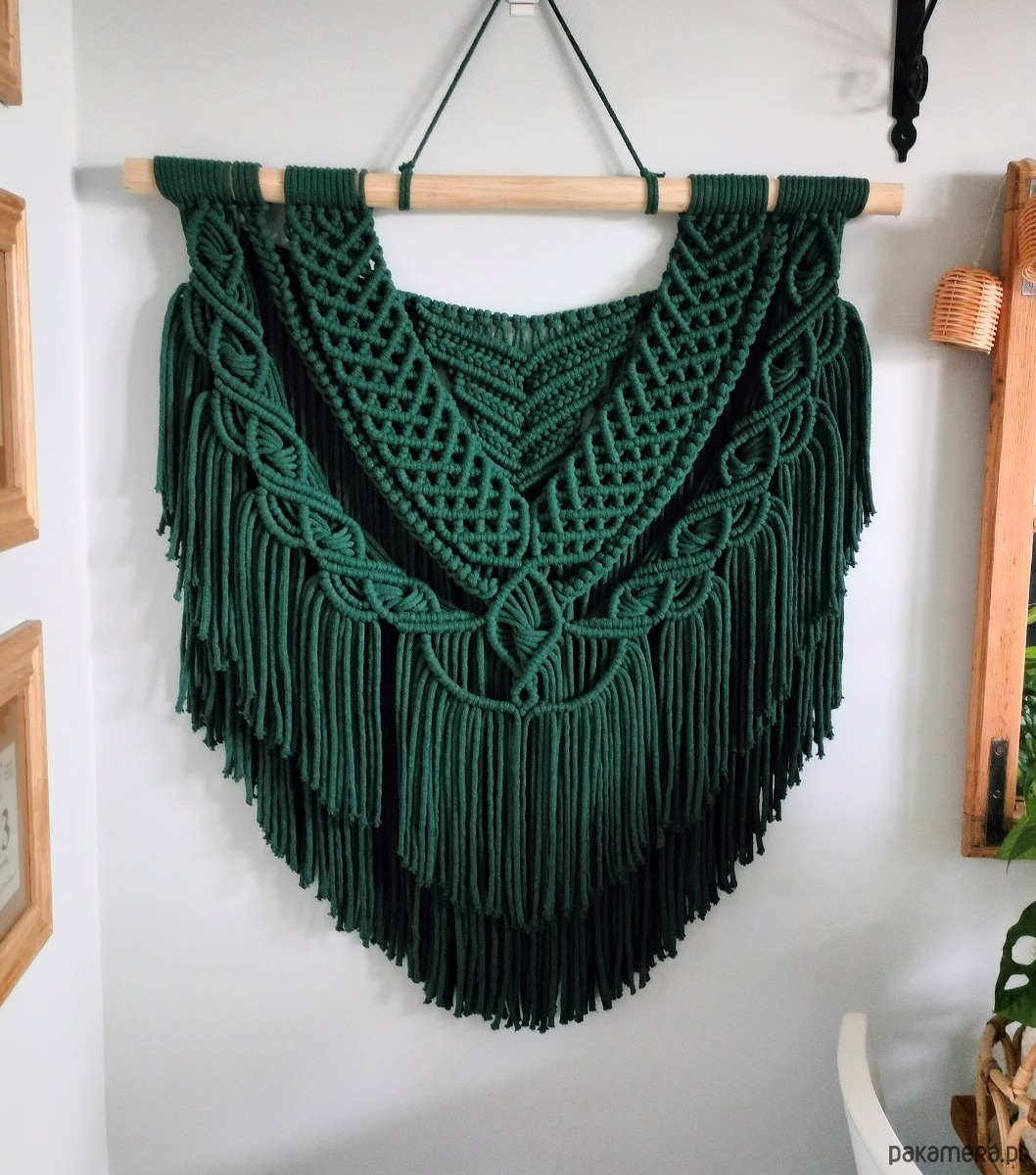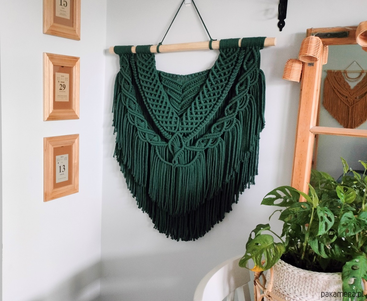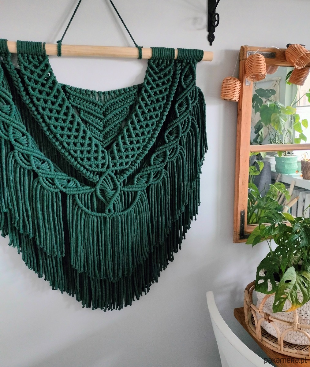 Rumba wykonana jest na naturalnej gałęzi, ze sznurka bawełnianego 5 mm w kolorze butelkowej zieleni. Co ważne, rdzeń sznurka jest dokładnie w kolorze sznurka, więc dół makramy jest jednolity kolorystycznie, a co za tym idzie- efekt końcowy jest dużo bardziej estetyczny.