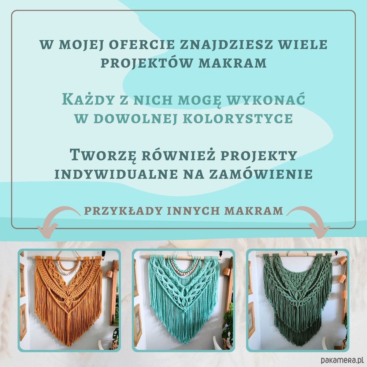 Możliwe jest wykonanie makramy w dowolnym kolorze. Kolor danego sznurka może nieznacznie odbiegać od tego na zdjęciu- spowodowane jest to różną kalibracją naszych monitorów, ale również delikatnymi różnicami w odcieniach w poszczególnych partiach sznurków.