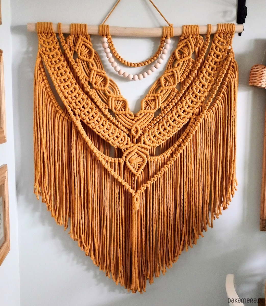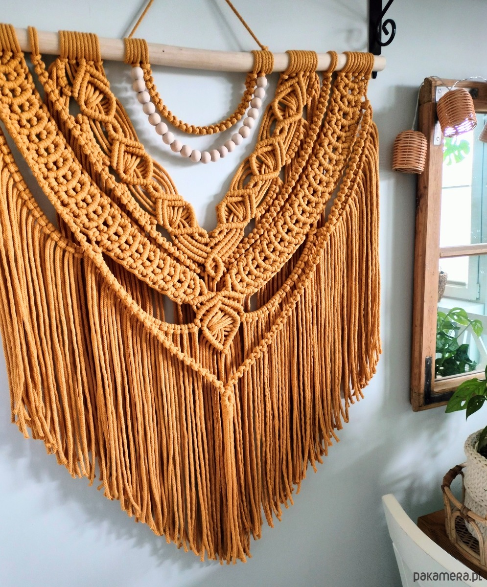 Salsa wykonana jest na naturalnej gałęzi, ze sznurka bawełnianego 5 mm w kolorze musztardy. Co ważne, rdzeń sznurka jest dokładnie w kolorze sznurka, więc dół makramy jest jednolity kolorystycznie, a co za tym idzie- efekt końcowy jest dużo bardziej estetyczny.