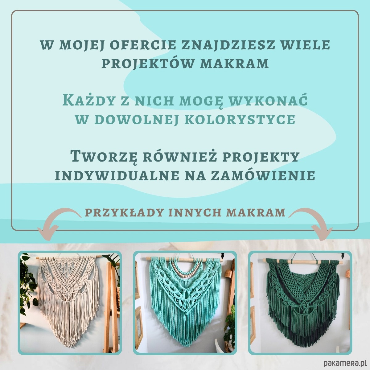 Możliwe jest wykonanie makramy w dowolnym kolorze. Kolor danego sznurka może nieznacznie odbiegać od tego na zdjęciu- spowodowane jest to różną kalibracją naszych monitorów, ale również delikatnymi różnicami w odcieniach w poszczególnych partiach sznurków.