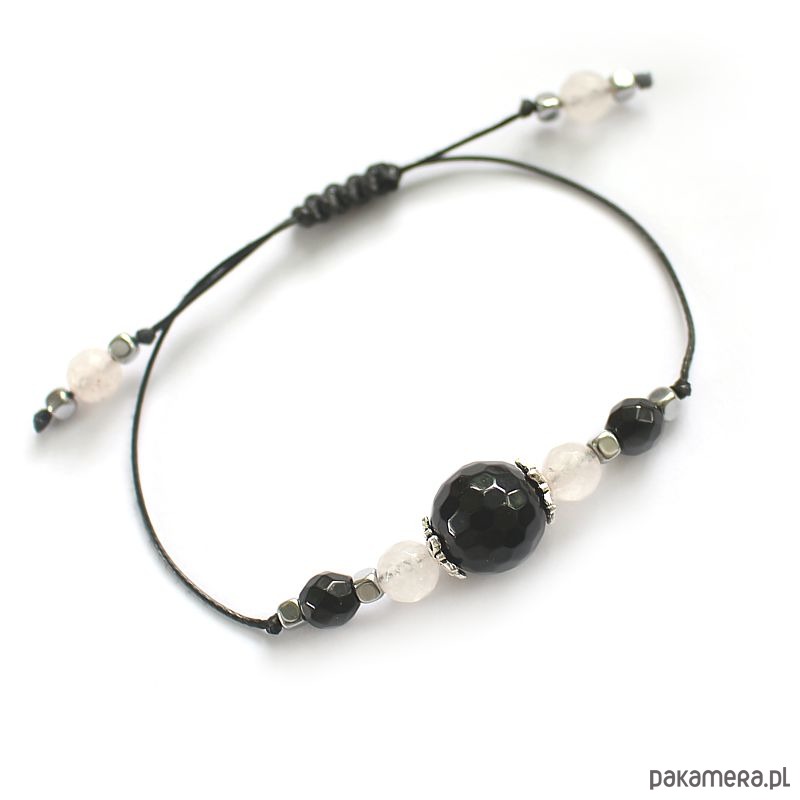 Energetyczna bransoletka wykonana techniką shamballa z fasetowanym onyksem, kwarcem różowym i hematytami wspierająca równowagę czakry serca, podstawy i trzeciego oka. ❤