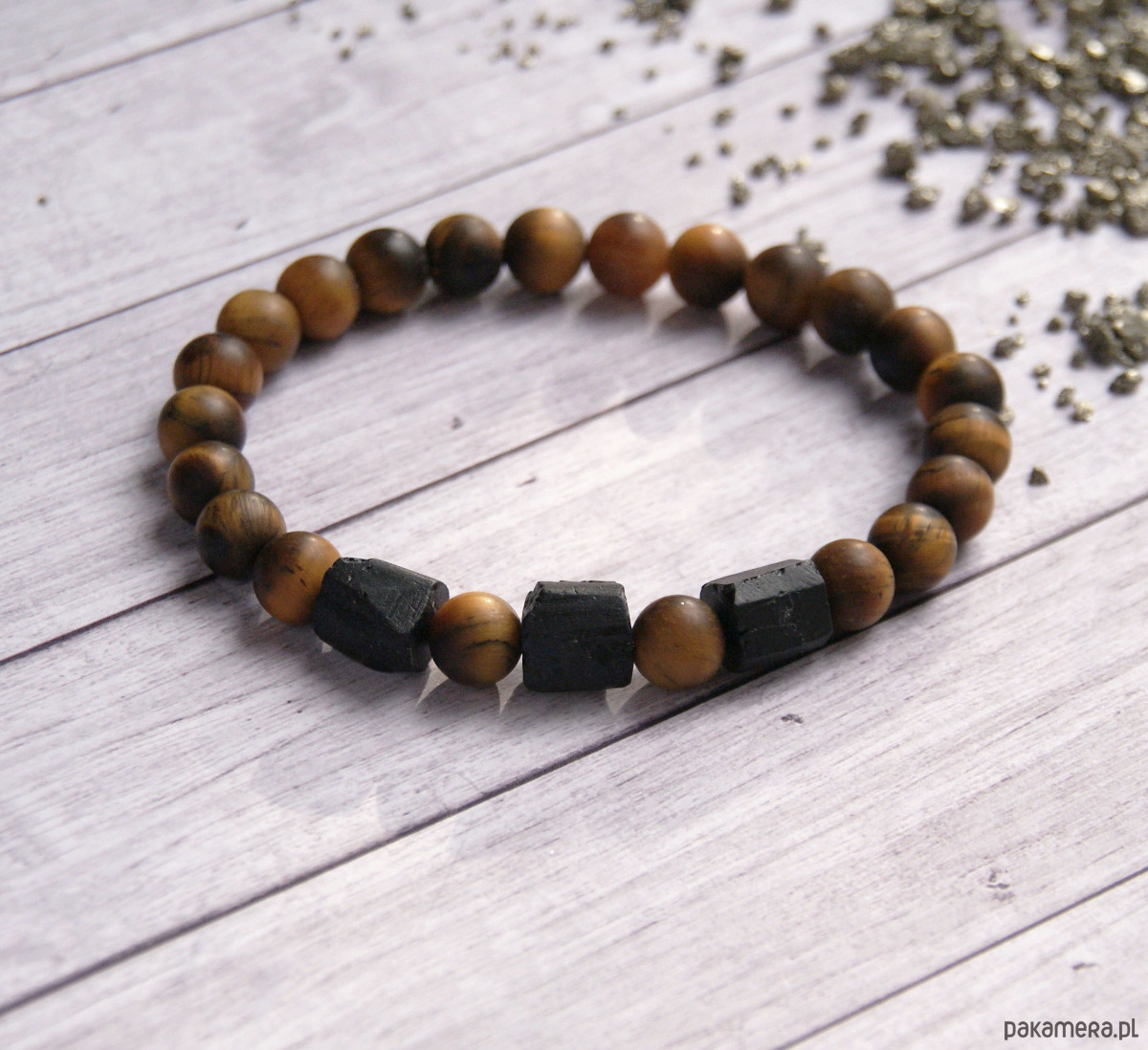 TUTAJ: niezwykle ciekawa bransoletka wykonana z kulek matowego tygrysiego oka (8mm) oraz trzech bryłek surowego czarnego turmalinu (wielkość i wygląd bryłek różni się nieco w każdej bransoletce). bransoletka na solidnej, czarnej gumce jubilerskie. brak elementów metalowych.