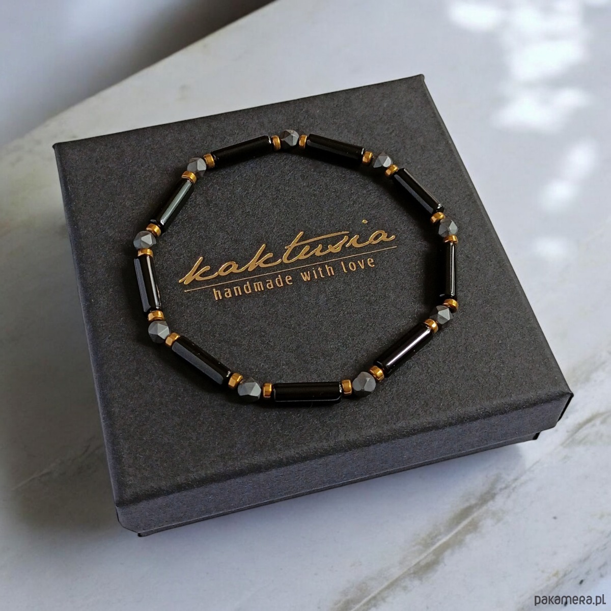 wykonana z onyksu błysk (słupki 4x13mm), matowego hematytu grafitowego o ciekawym szlifie gwiazdkowym 4mm, przekładek ze złotego hematytu.