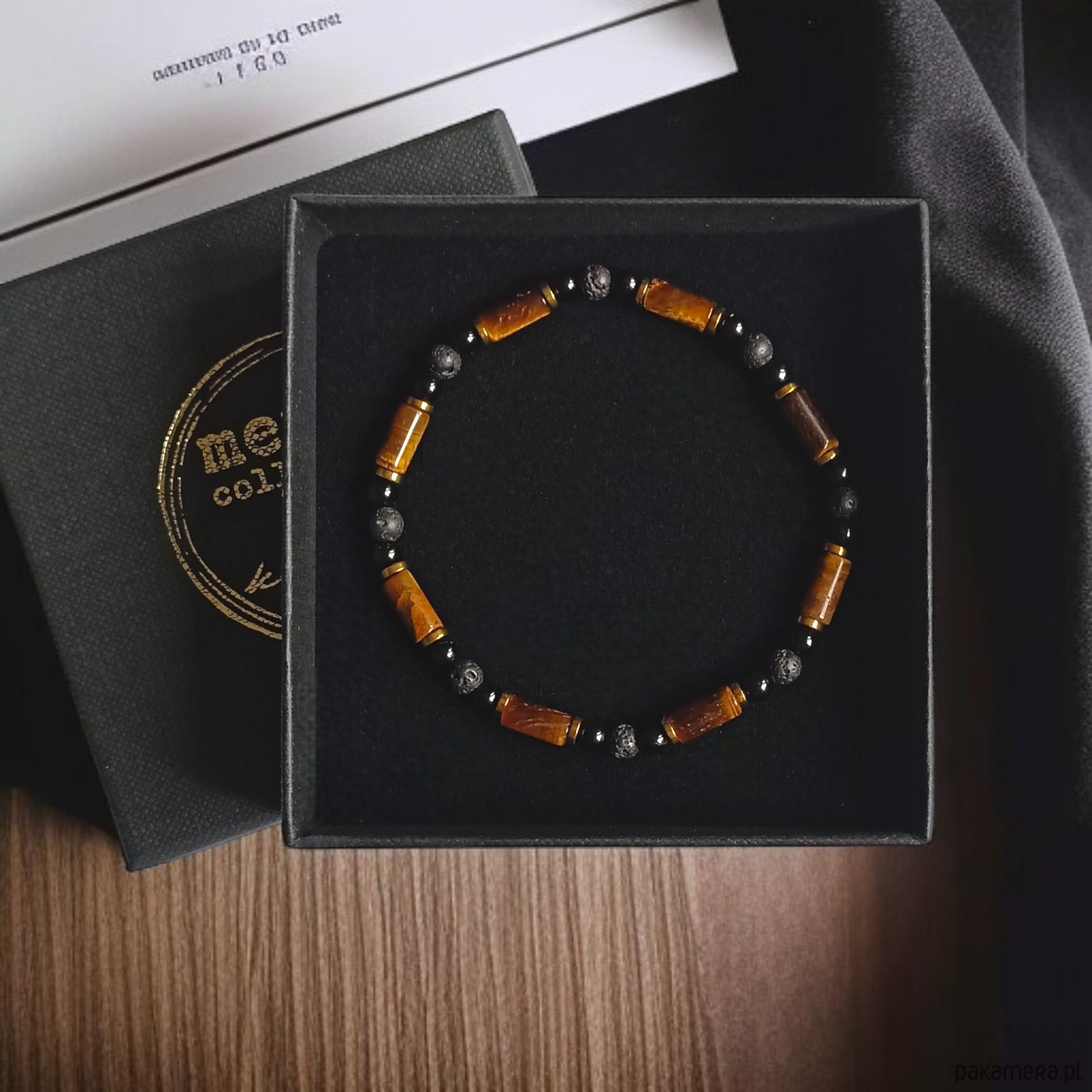 wykonana z tygrysiego oka (słupki o przekroju ok.4mm), porowatej lawy oraz onyksu błysk i przekładek ze złotego hematytu.