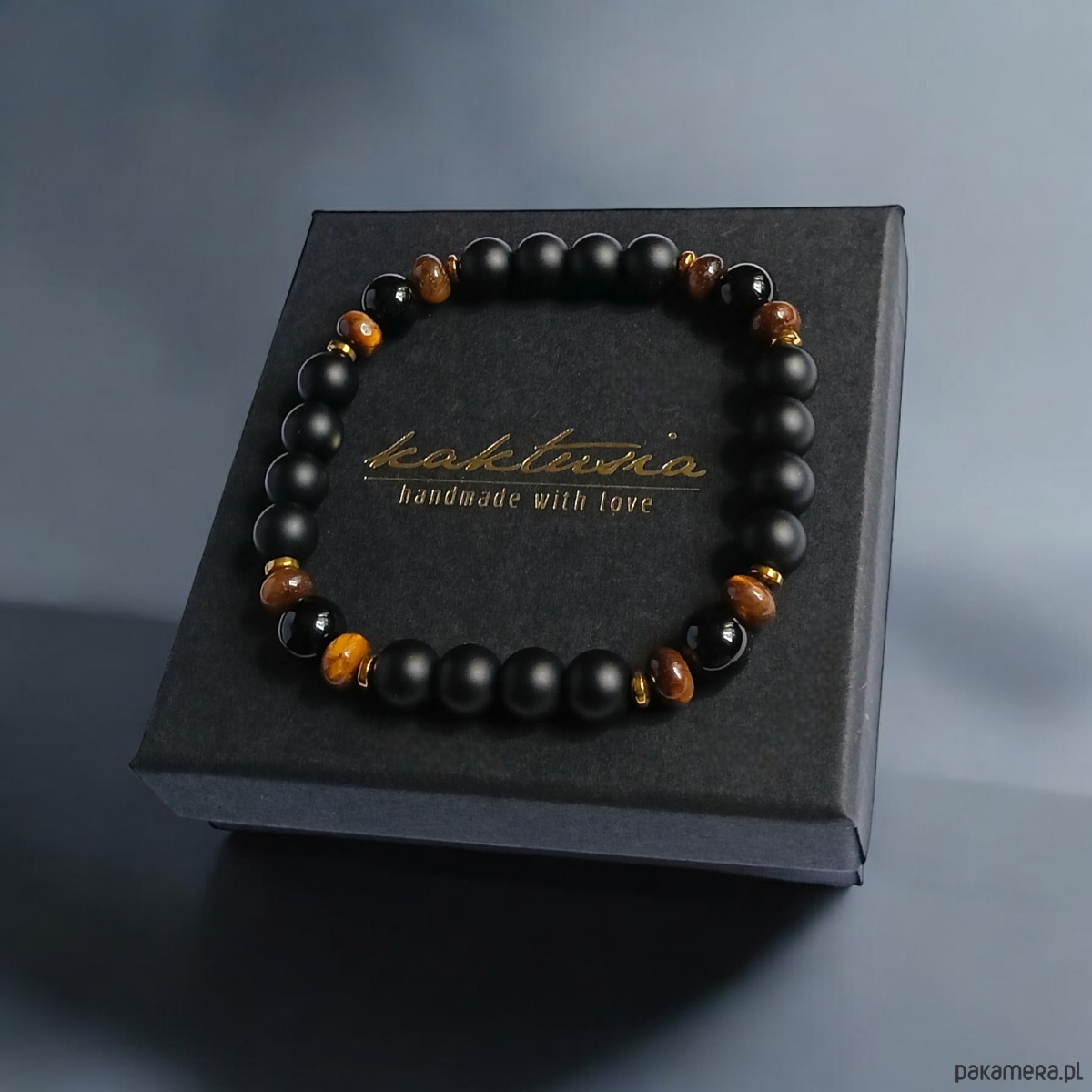 wykonana z matowego onyksu i onyksu błysk (8mm), oponek tygrysiego oka, przekładek ze złotego hematytu
