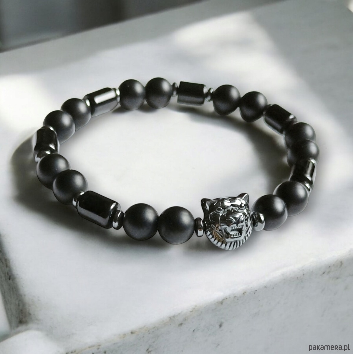 niezwykle ciekawa bransoletka- talizman wykonana z rzeźbionego hematytu (głowa tygrysa), matowego onyksu (8mm), wałeczków onyksu błysk, przekładek z grafitowego hematytu