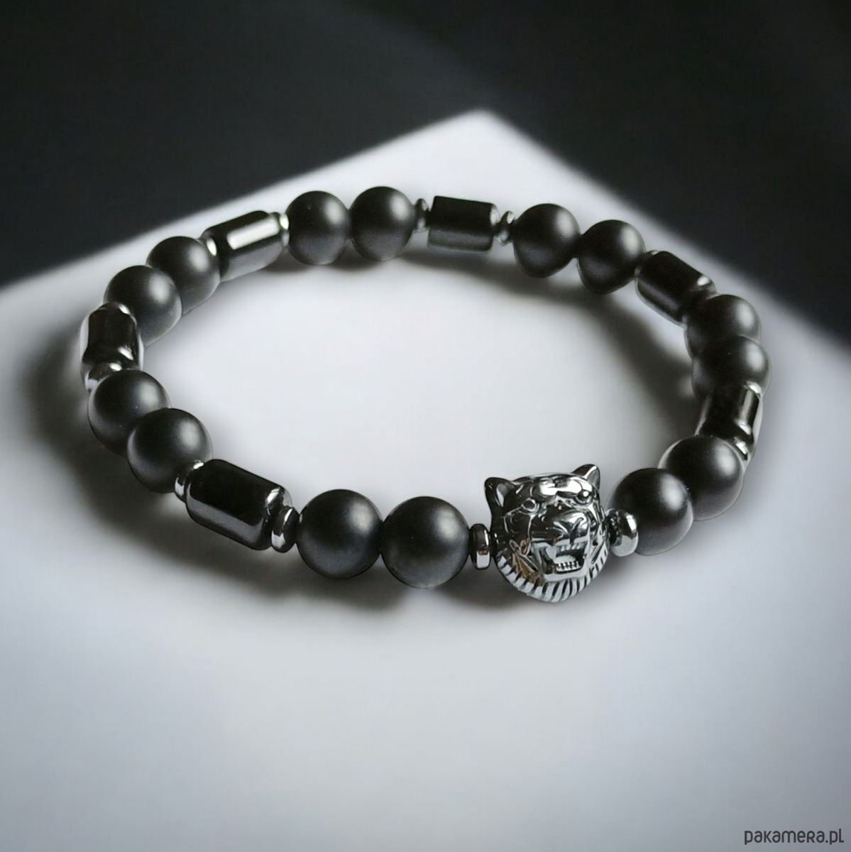 niezwykle ciekawa bransoletka- talizman wykonana z rzeźbionego hematytu (głowa tygrysa), matowego onyksu (8mm), wałeczków onyksu błysk, przekładek z grafitowego hematytu