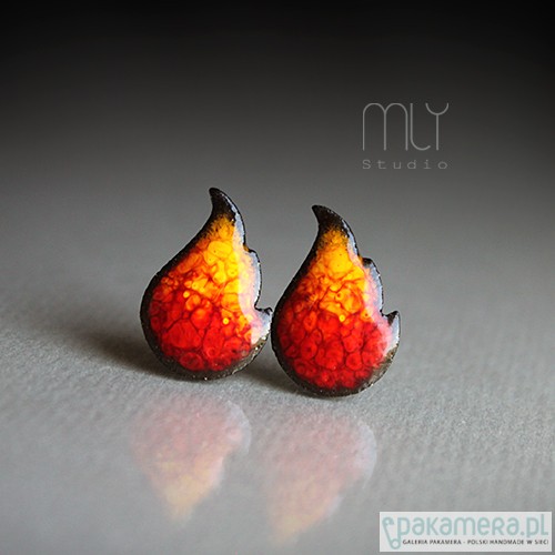 Oryginalne ceramiczne kolczyki w formie sztyftów, ręcznie wykonane z delikatnej kamionki, jednostronnie szkliwione czerwonym i żółtym szkliwem z efektem drobnych plamek, na antyalergicznych sztyftach w kolorze srebrnym. Długość ok 17mm. Polecam