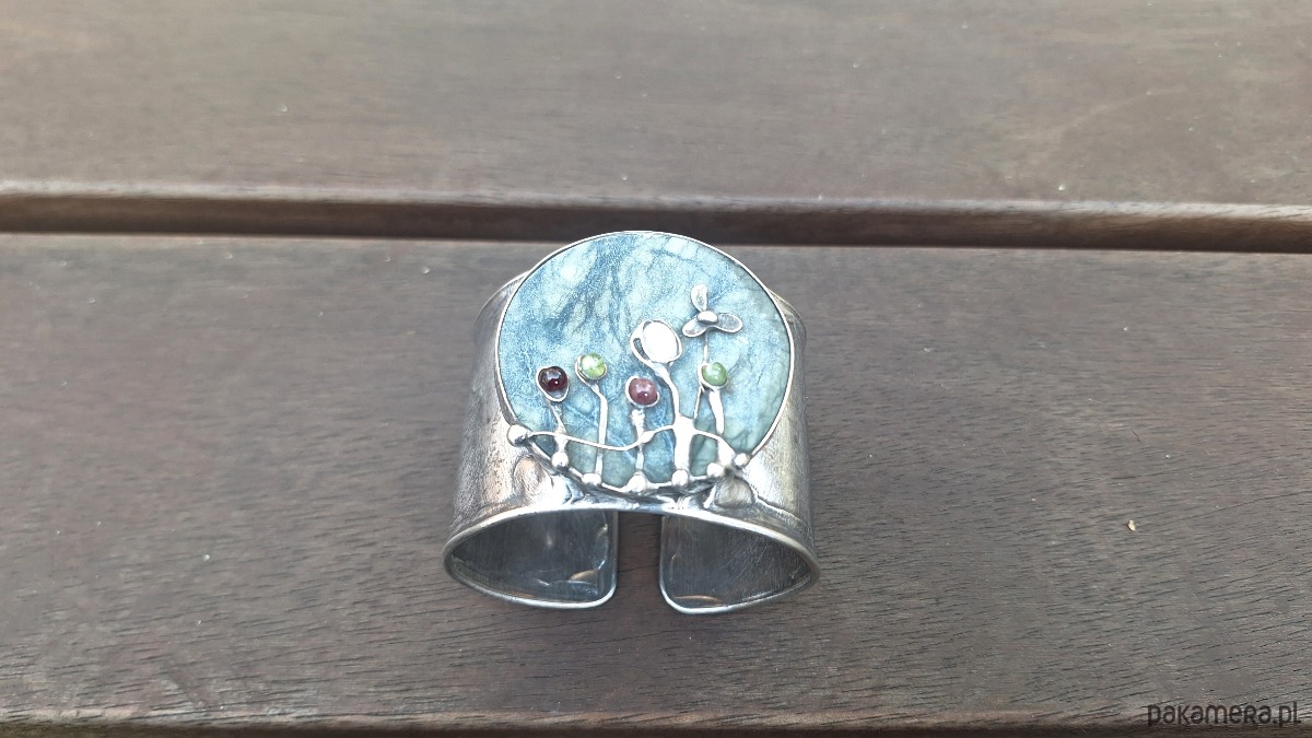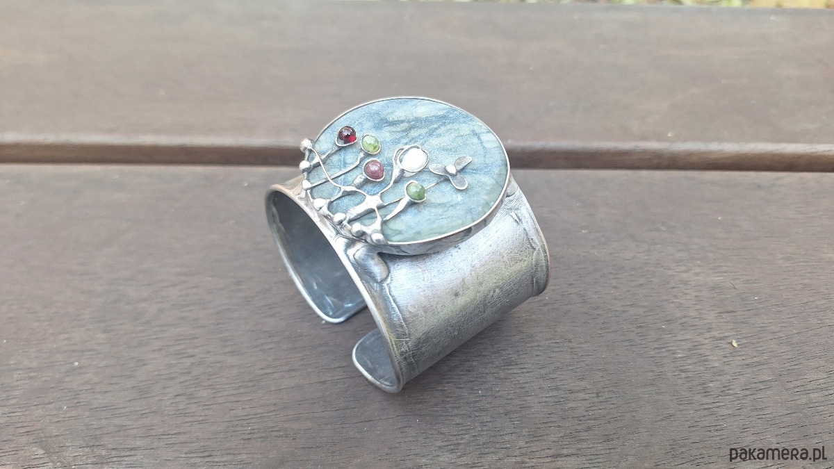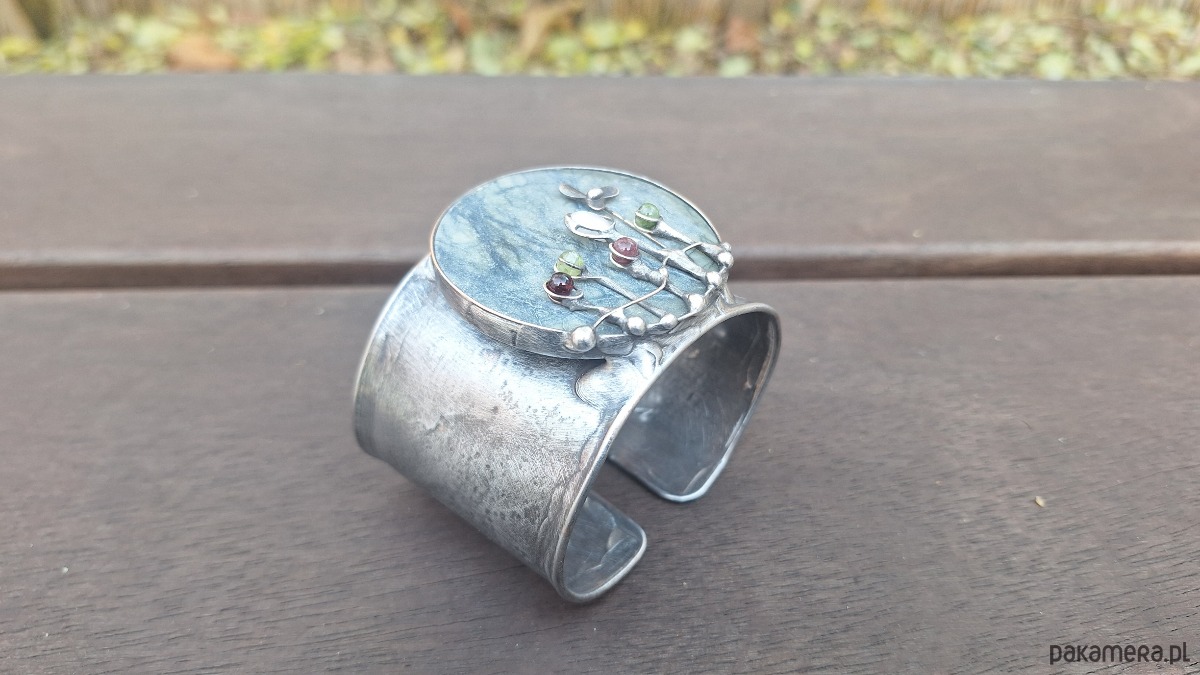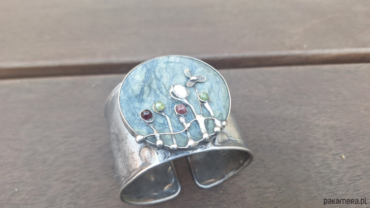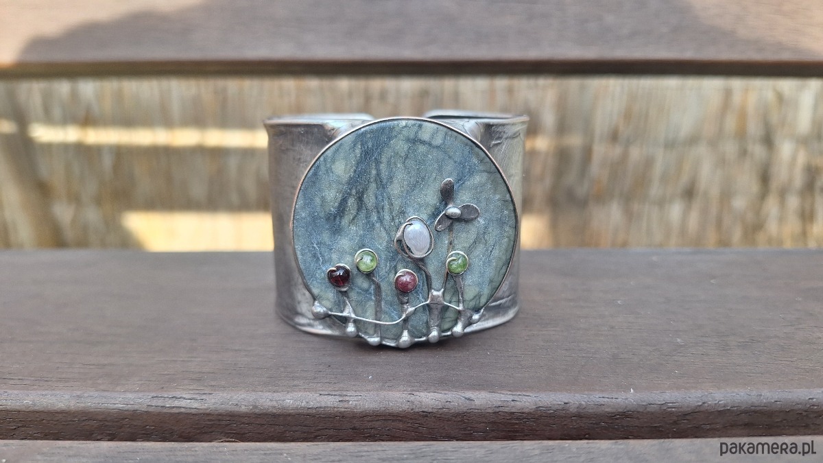 Bransoletka wykonana z miedzi, cyny, jadeitu, turmalinu, perły i granatu. Szerokość ok. 5 cm. Regulowana.