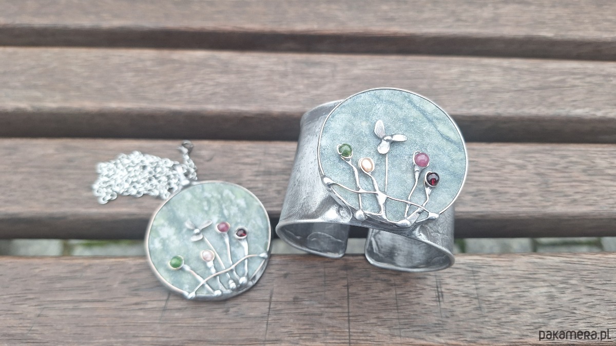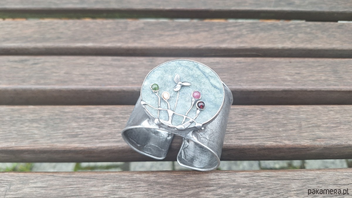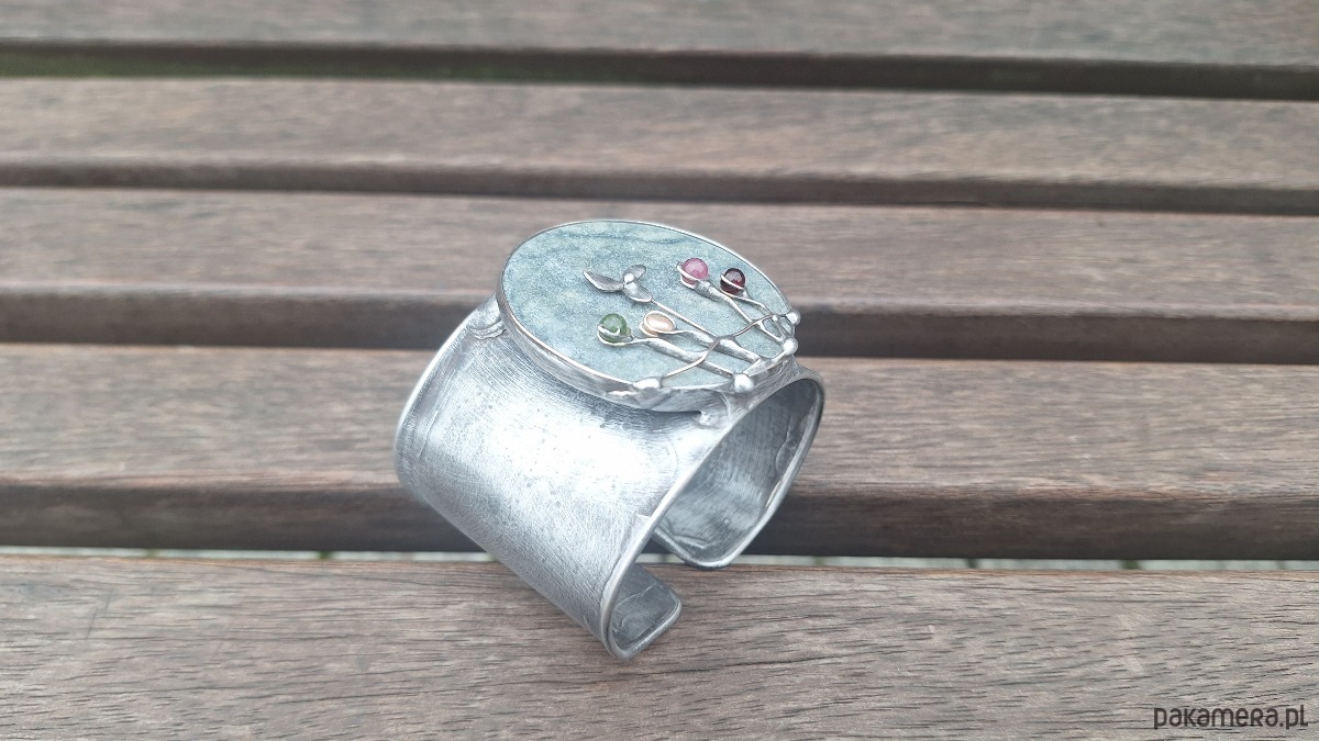 Bransoletka wykonana z miedzi, cyny, jadeitu, turmalinu, perły i granatu. Szerokość ok. 5 cm. Regulowana.