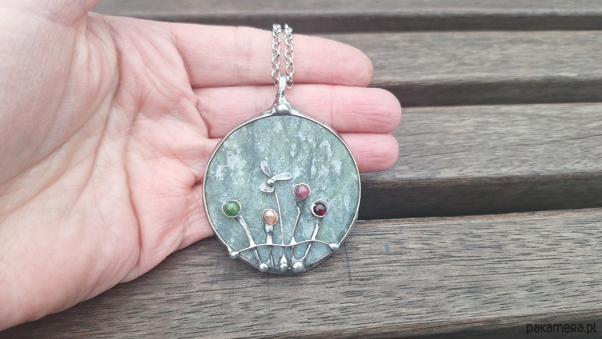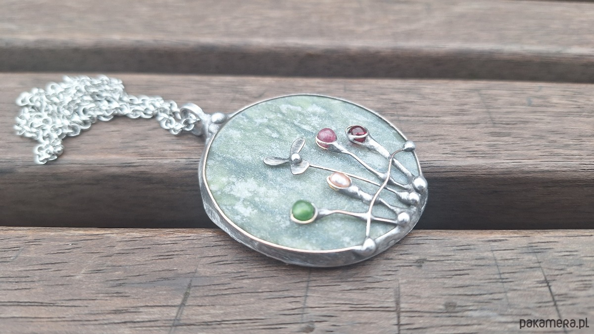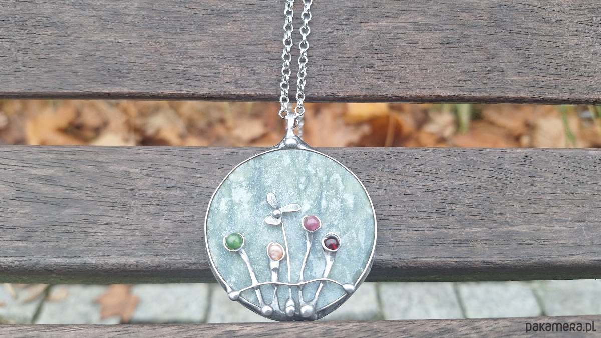 Wisiorek o średnicy ok. 5 cm, łańcuszek ok. 50 cm.