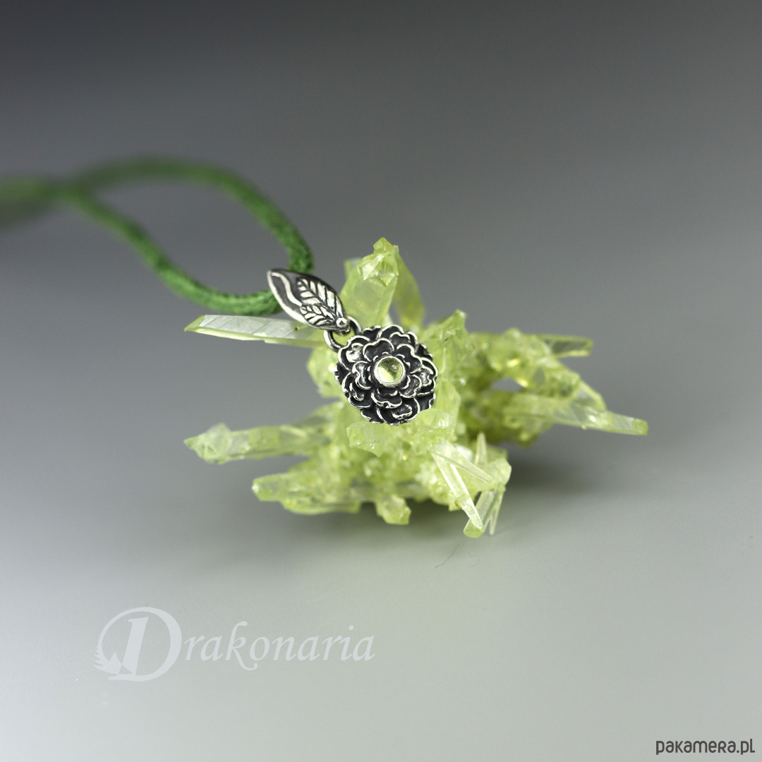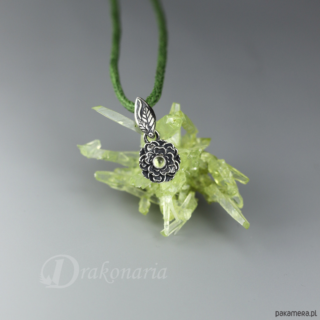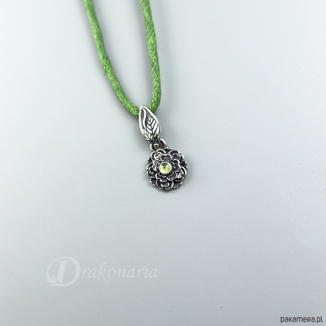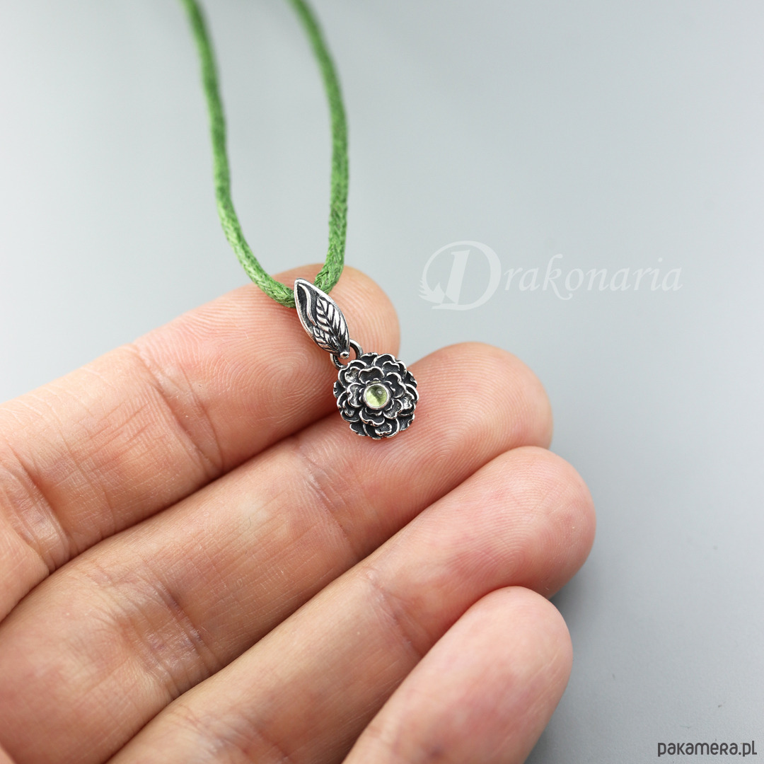 Ultra maleńki, subtelny wisiorek w formie kwiatka, wykonany ze srebra pr. 925, ozdobiony słonecznie zielonym, naturalnym peridotem (2mm) i ruchomą, rzeźbioną krawatką z miniaturowymi listkami. Oksydowany i polerowany.