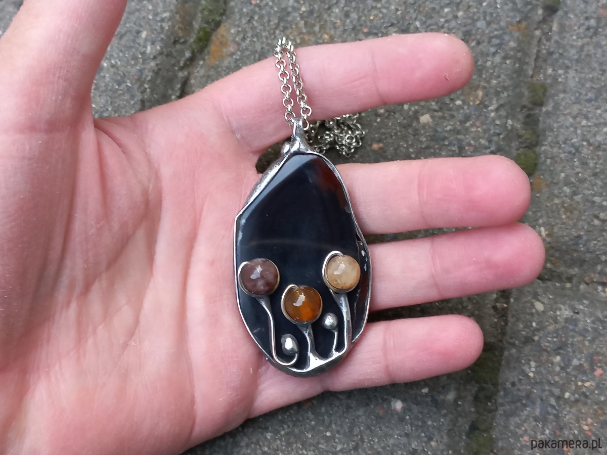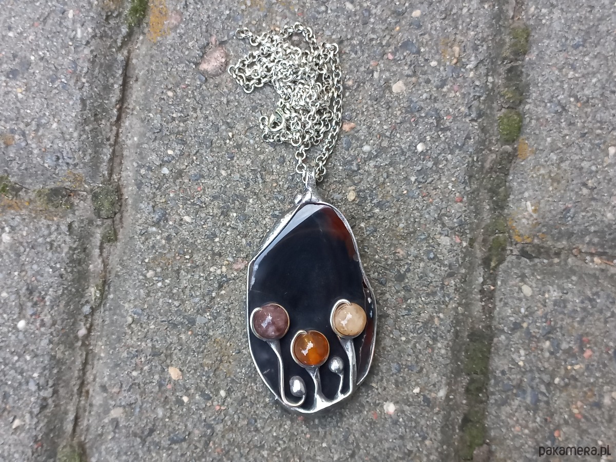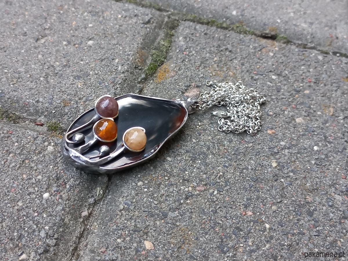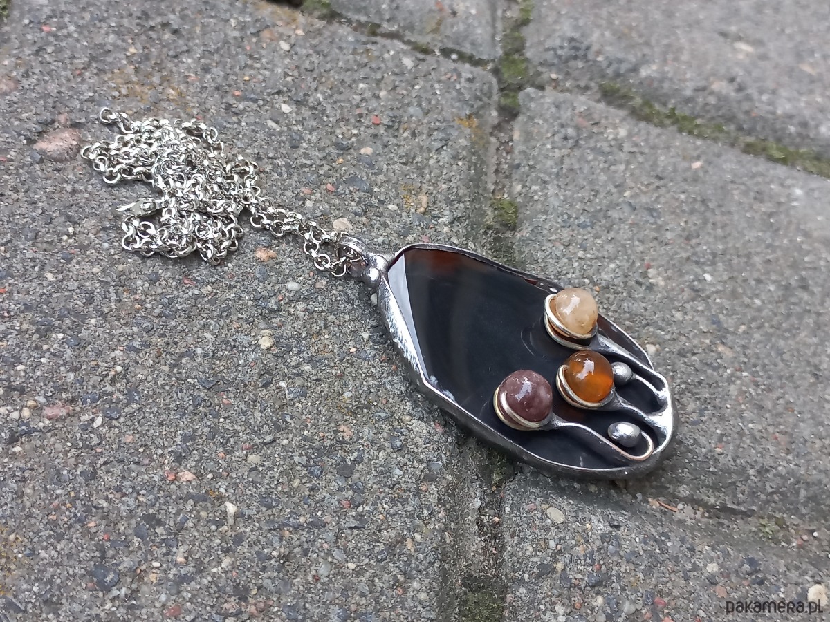 Wisiorek wykonany z miedzi, cyny i agatów. Wymiary ok. 5,5 na 3,3 cm. Zawieszony na łańcuszku o długości ok. 50 cm.