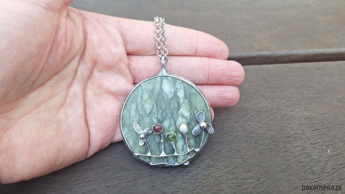 Wisiorek wykonany z miedzi, cyny, jadeitu, turmalinu, granatu i perły. Wymiary ok. 5 na 5 cm. Zawieszony na łańcuszku o długości ok. 50 cm.