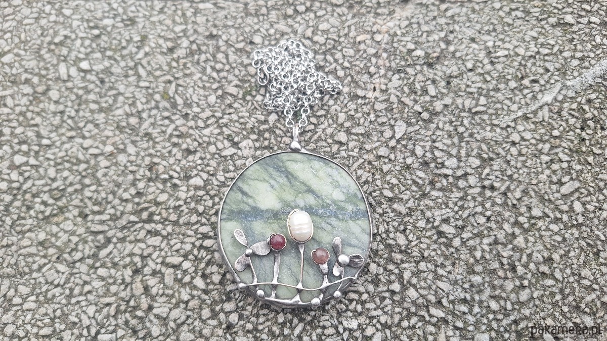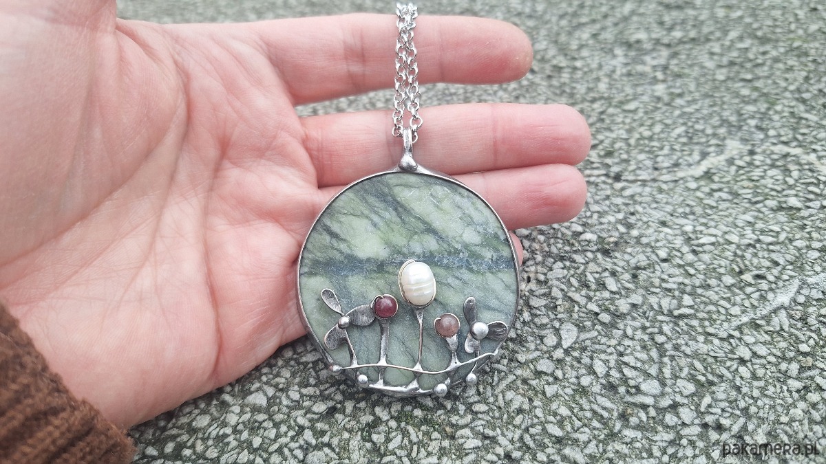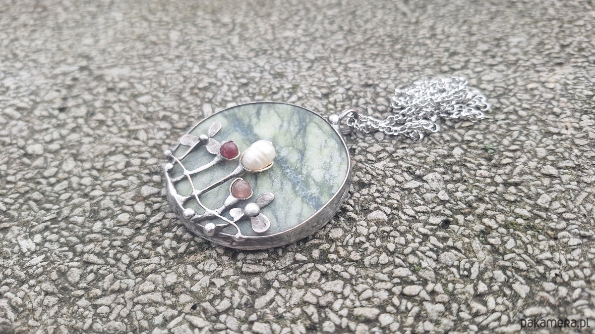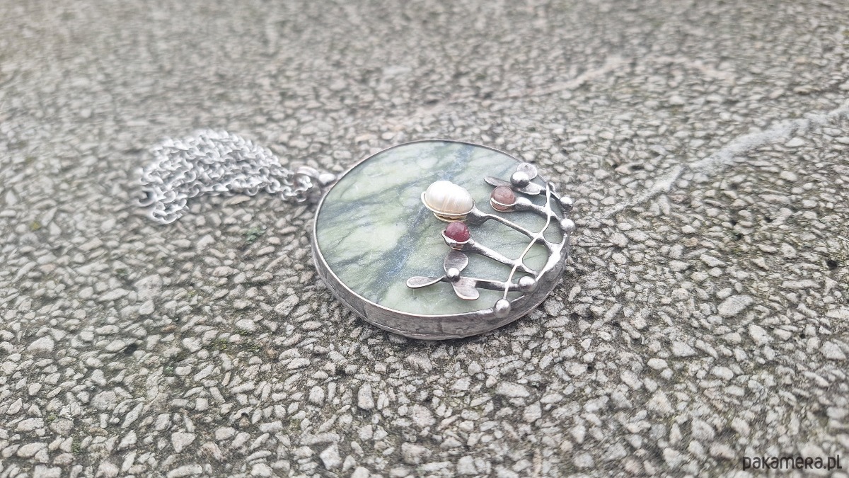 Wisiorek wykonany z miedzi, cyny, jadeitu, turmalinu, granatu i perły. Wymiary ok. 5 na 5 cm. Zawieszony na łańcuszku o długości ok. 50 cm.