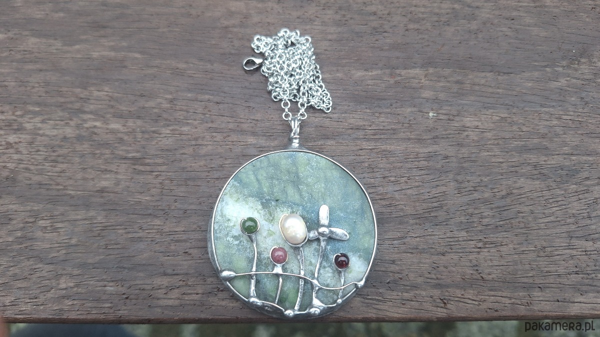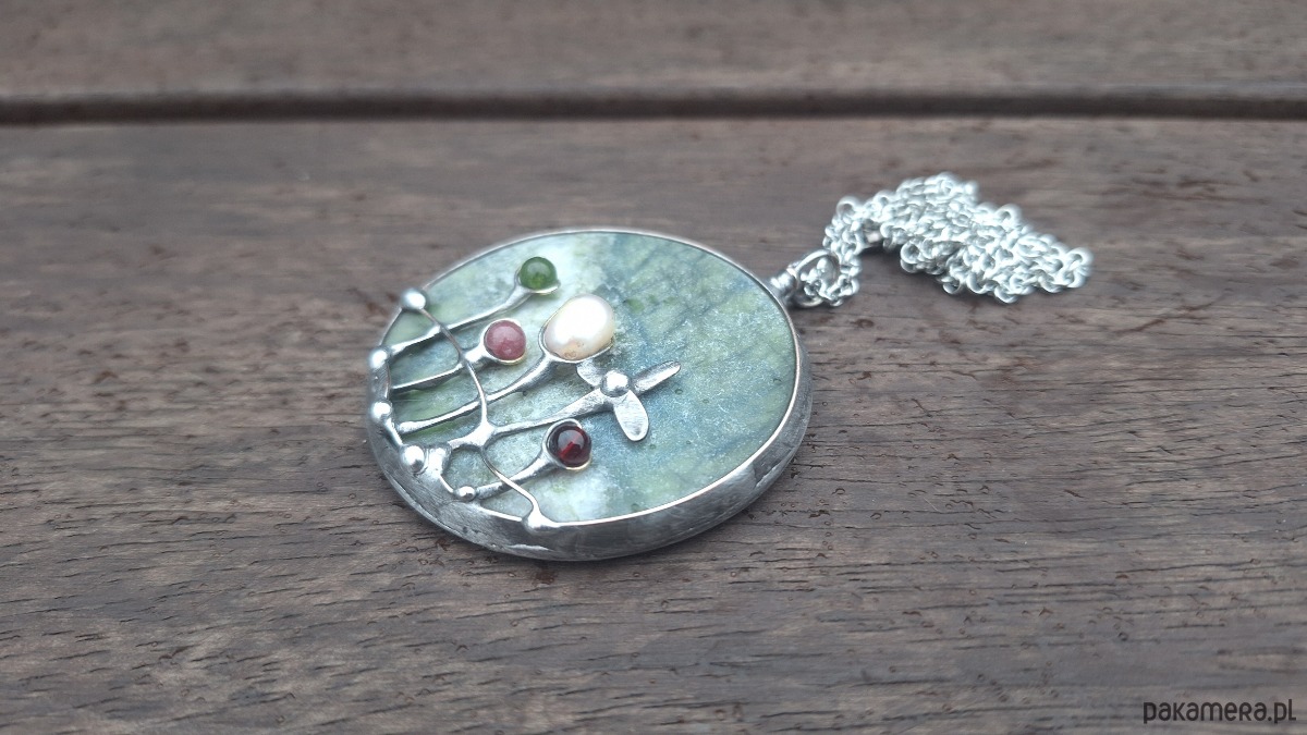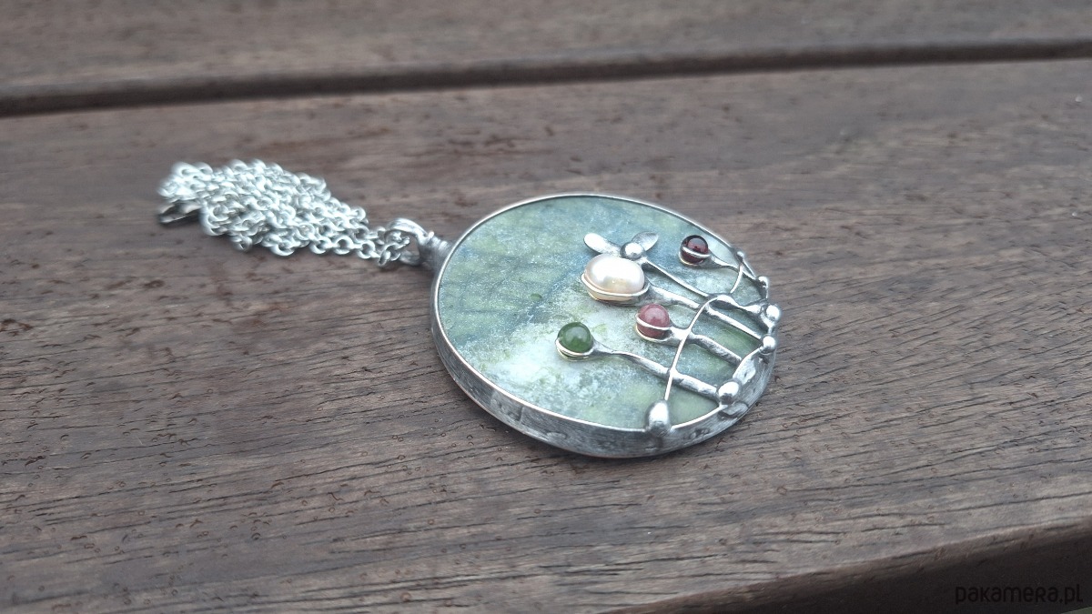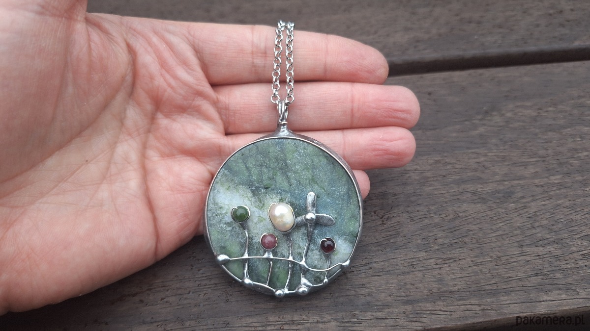 Wisiorek wykonany z miedzi, cyny, jadeitu, turmalinu, perły i granatu. Wymiary ok. 5 na 5 cm. Zawieszony na łańcuszku o długości ok. 50 cm.