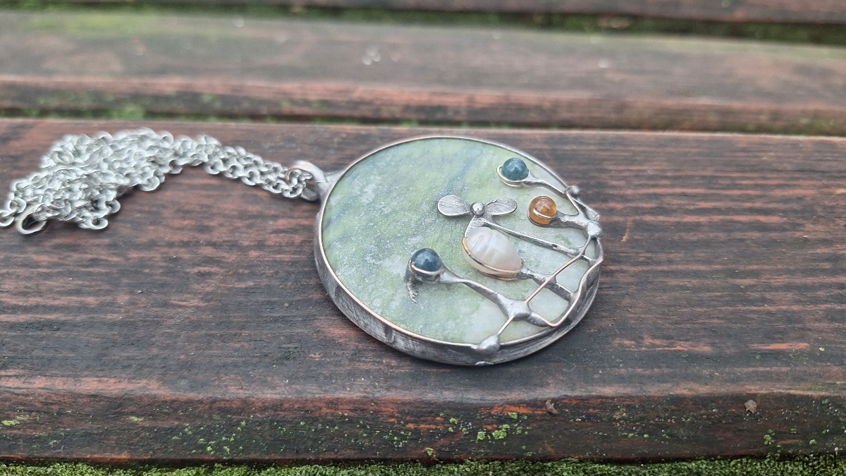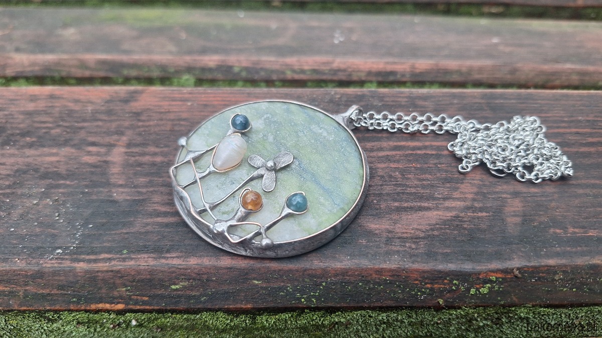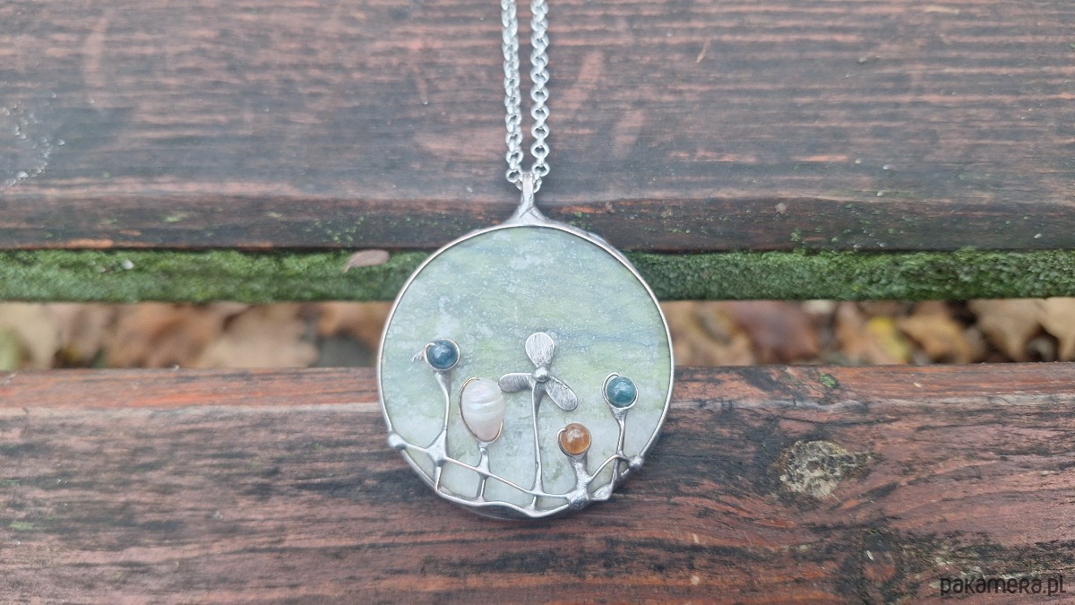 Wisiorek wykonany z miedzi, cyny, jadeitu, turmalinów i perły. Wymiary ok. 5 na 5 cm. Zawieszony na łańcuszku o długości ok. 50 cm.